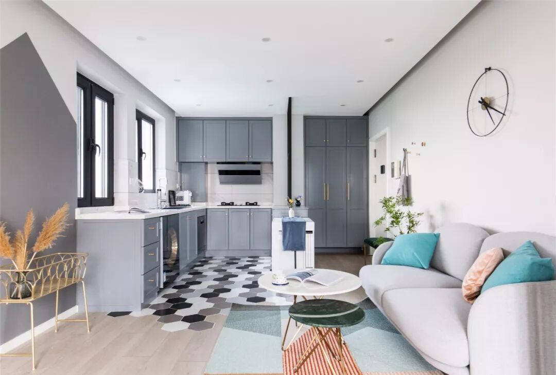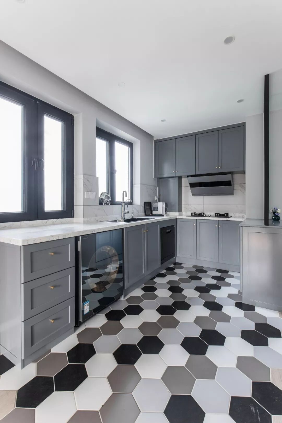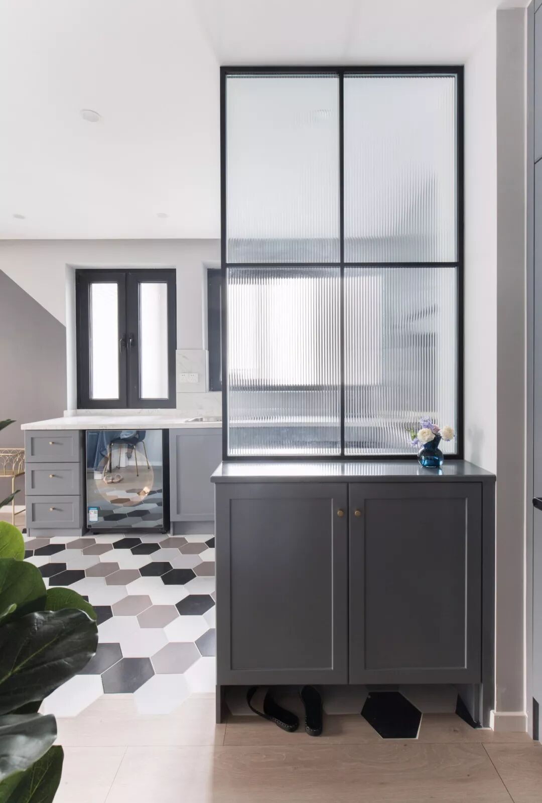 ▲玄关的定制鞋柜+玻璃屏风隔断,让进门后的开放式厨房保持一定的私密性,而地面的杂色六边砖搭配,也是让空间显得更加文艺舒适。