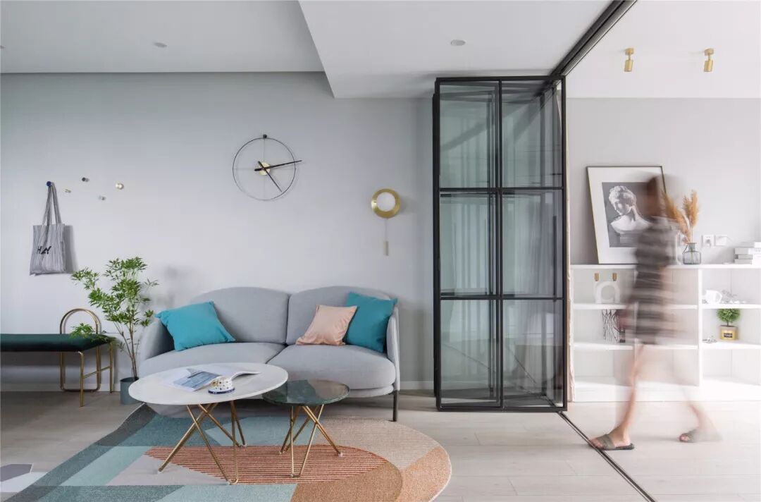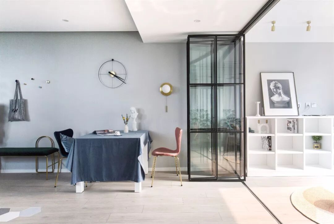 ▲餐厅与客厅中间做了以上玻璃折叠门,让客厅区域可以变身更加安静优雅的空间。餐厅旁边的墙面挂上极简时钟,也让空间显得更加优雅时尚。