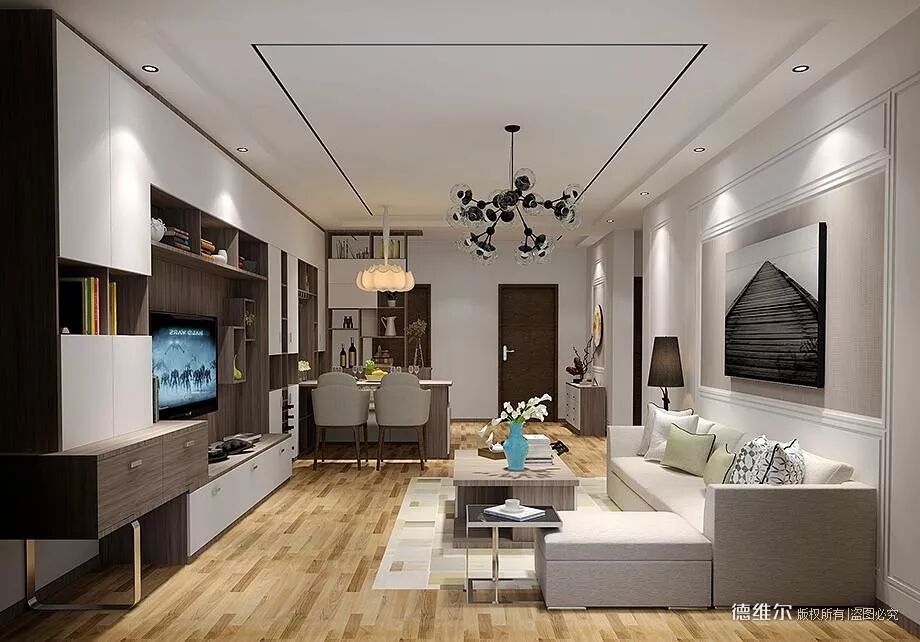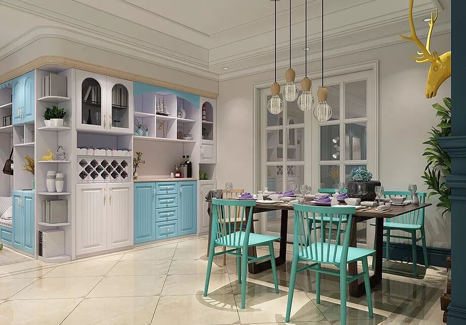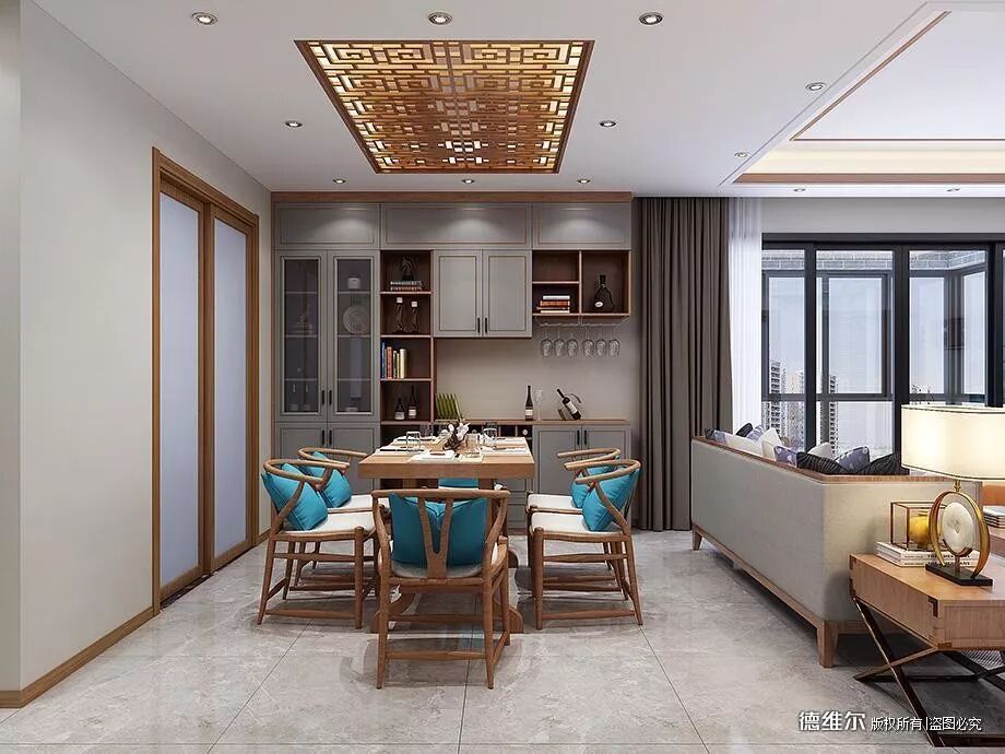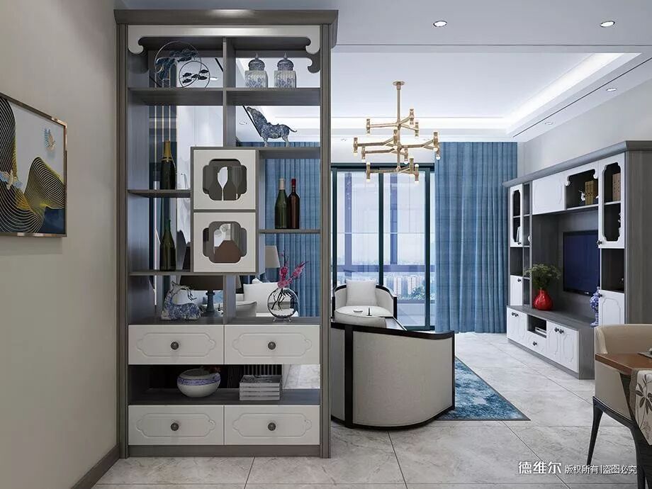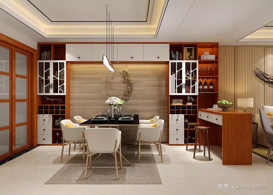 横跨大半个客餐厅的到顶组合柜,集电视柜、装饰柜、酒柜、玄关柜于一体,大气恢宏,更具艺术美感。