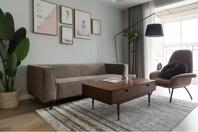 客厅的左右两侧都摆放了一些绿植作为点缀,舒适的布艺沙发加上带有收纳的茶几,让这个小客厅变得更为惬意和实用。