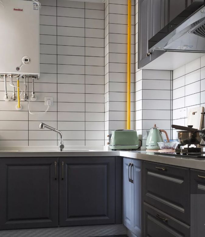厨房内部的橱柜是选择了灰蓝色的,搭配这种黑色的大理石地砖,看起来非常大气,墙面做白色的小砖,可以缓解压抑感。