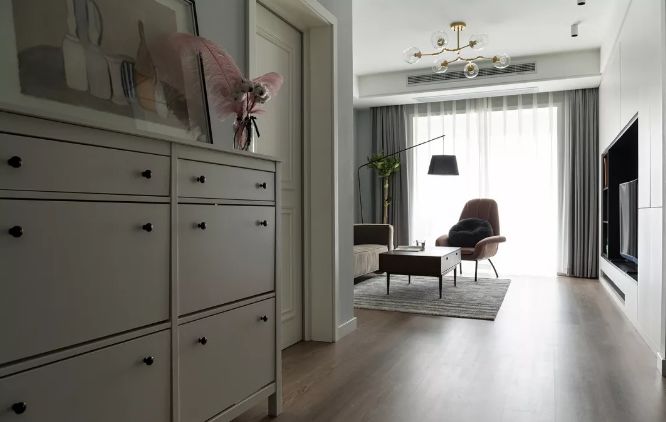 入户没有玄关走廊的户型,设计师在入户门的侧方摆放了矮鞋柜,鞋柜的上方还可以摆放装饰品,底部留空就可以放日常更换的鞋子。