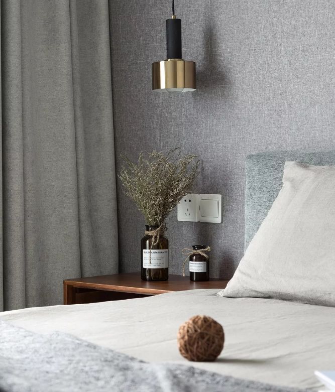 床头两侧的柜子是选择了深木色的,上方的吊灯还加入了一些金属元素,让这个卧室空间看起来更有档次感一些,这种轻奢风的设计也让人感觉非常喜欢。