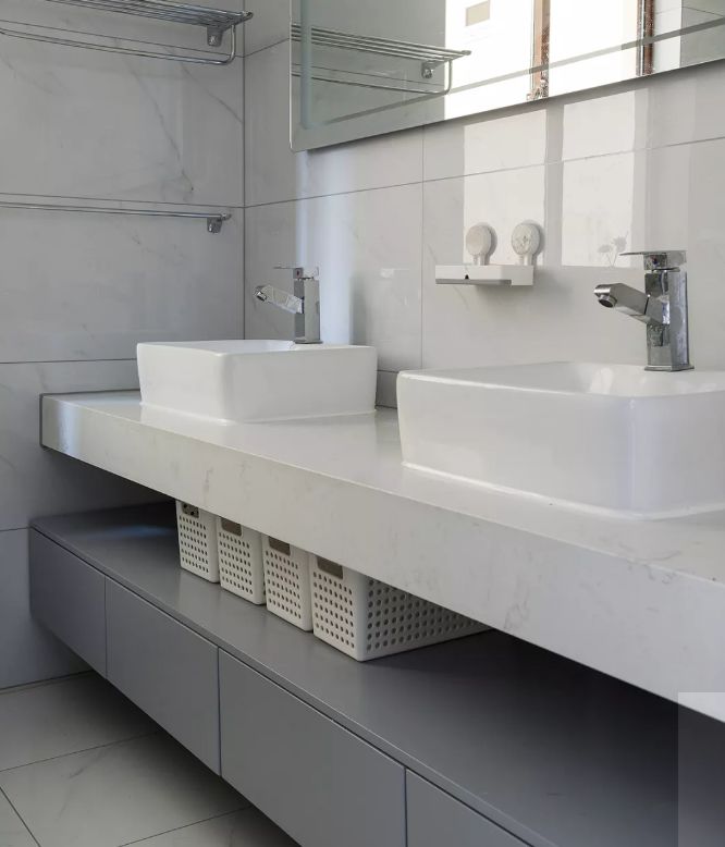 卫生间内做了双台盆的设计,平时一家人洗漱会更方便一些,上方的浴室镜做得大了一些,让卫生间看起来更为宽敞一些。