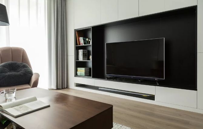 客厅的电视背景墙也是被改成了储物款的,黑色与白色结合的柜子带来一些时尚感。在电视的边上和底部留出一些空间用来摆放零碎物品。