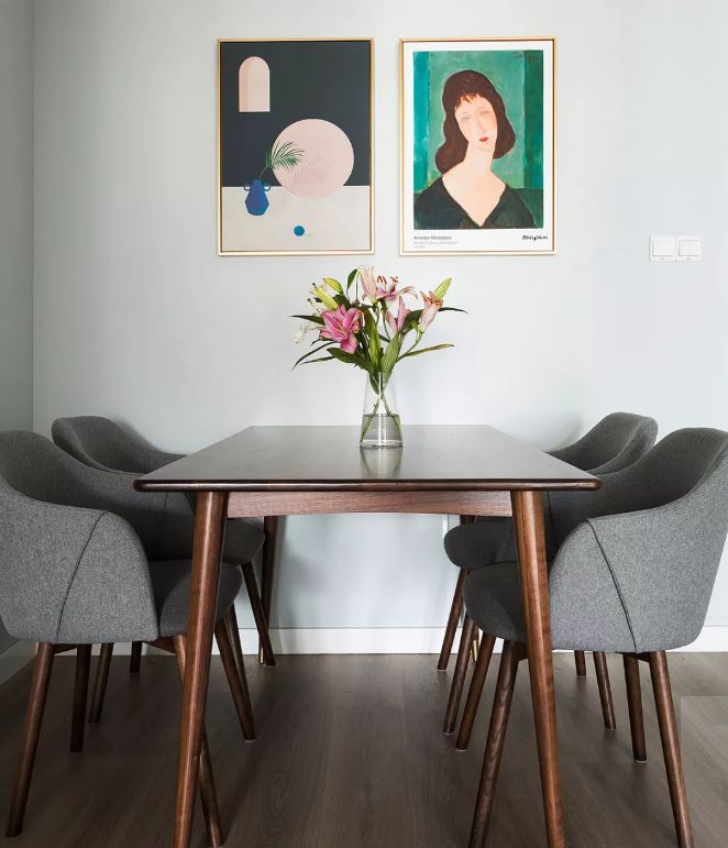 入户门的另一侧就是餐厅空间,原木风的餐桌椅搭配灰色调的布艺坐垫,墙面被刷成了浅蓝色,墙上的两幅装饰画款式有着一些复古感。