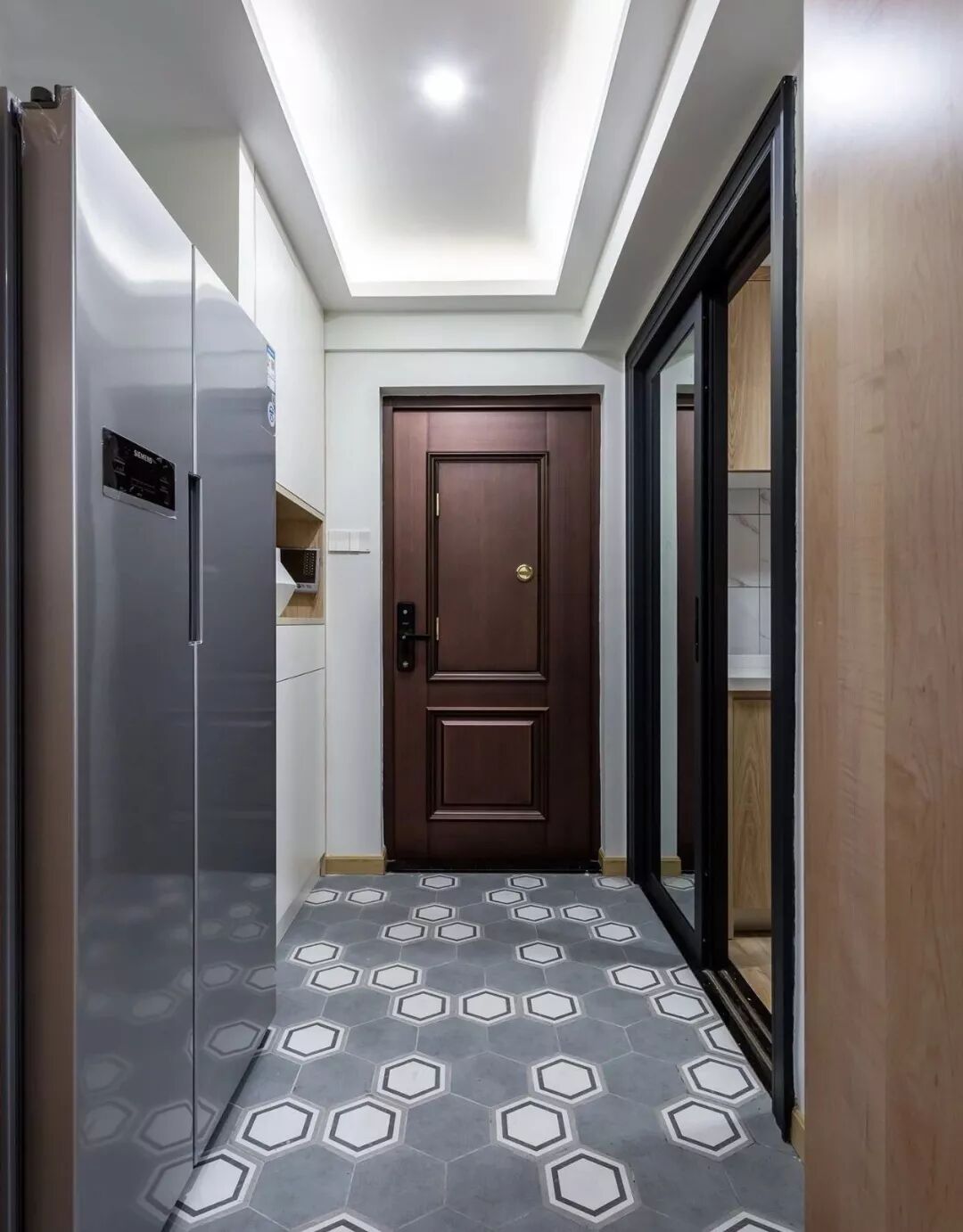 ▲ 使用面积97平,入户落尘区铺贴拼色六角砖,设置黑框玻璃移门与厨房隔断,同时保障玄关采光和通透性