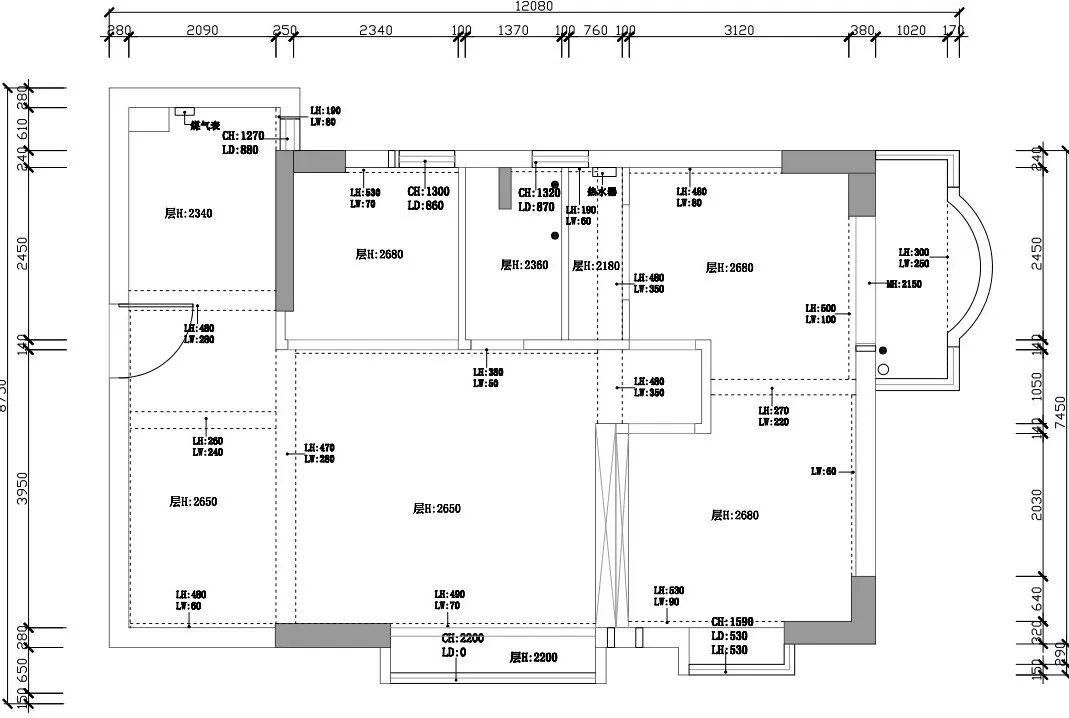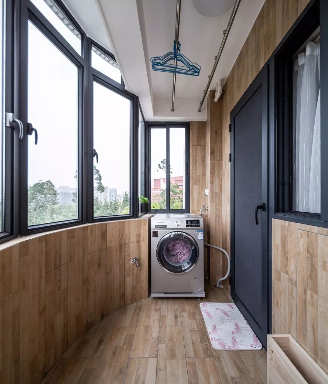 ▲ 弧形阳台,木纹砖墙地一体,预留出洗衣机与洗衣池位置(平面图上可以看到洗衣池位置),顶部设计晾衣架,既是观景台又是生活阳台