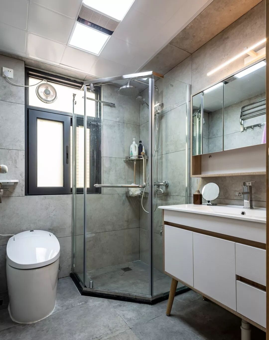 ▲ 卫生间,墙地面通铺灰色石纹砖,成品浴室柜与半开放式镜柜解放台面空间,干净整洁