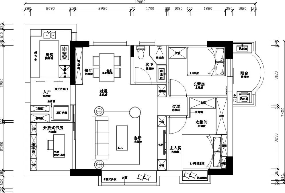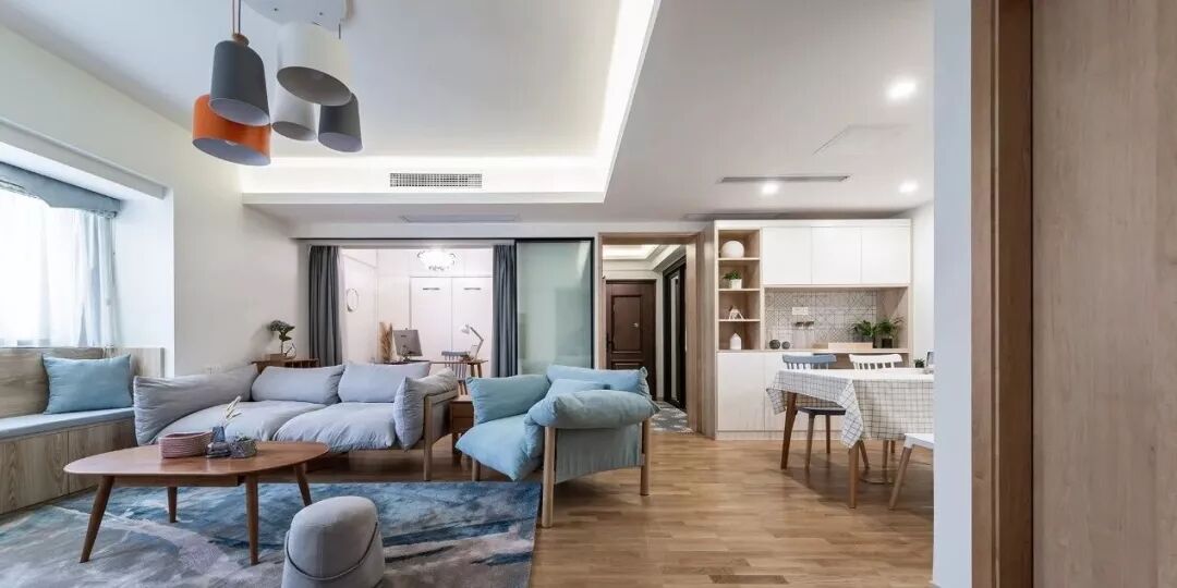 ▲ 客厅,木纹砖加铺大张地毯,极简顶面点缀组合吊灯,沙发背后是可开放可独立的书房,可以满足空间的多样化需求