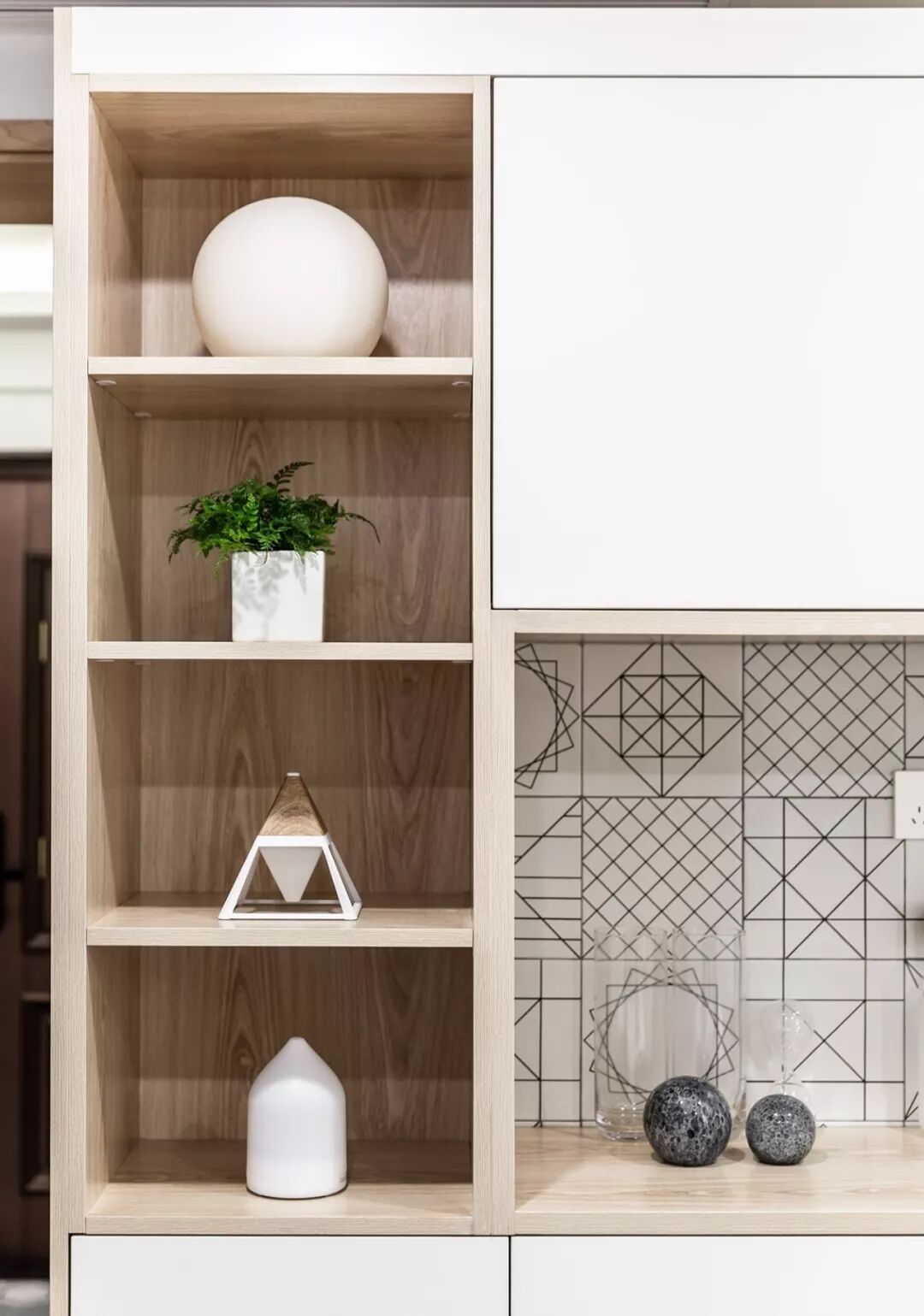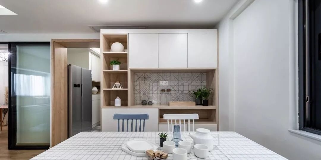 ▲ 靠墙设置大面积定制柜,满足餐边收纳,中部留空,花砖铺贴背景并预留插座,打造西厨区域,体现业主对生活情调的小追求