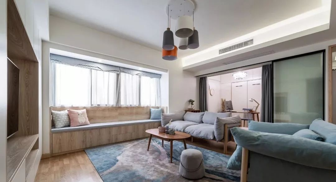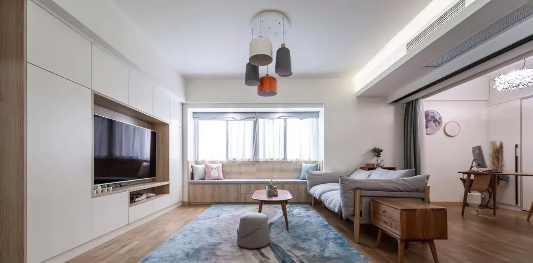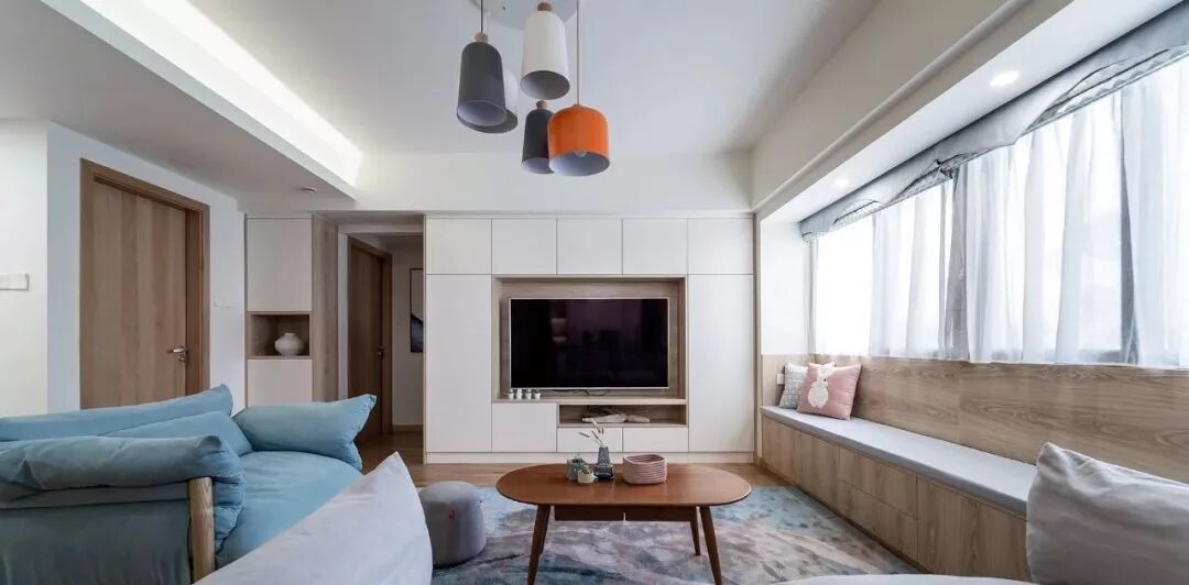 ▲ 定制整面收纳型电视背景墙,提高客厅储物能力,白+木的设计增添层次感