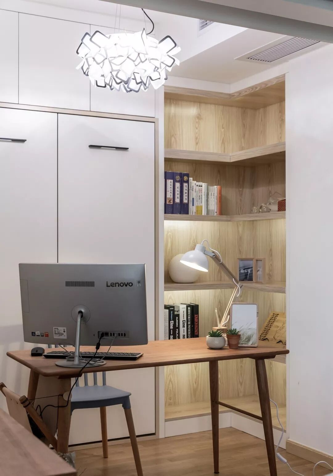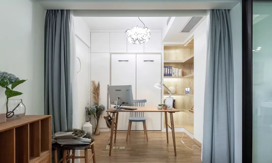 ▲ 半开放式书房,将墨菲床、储物柜、书柜三者结合到一体,需要时拉上移门与窗帘,可作客卧使用