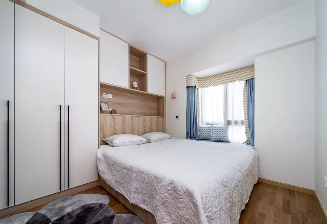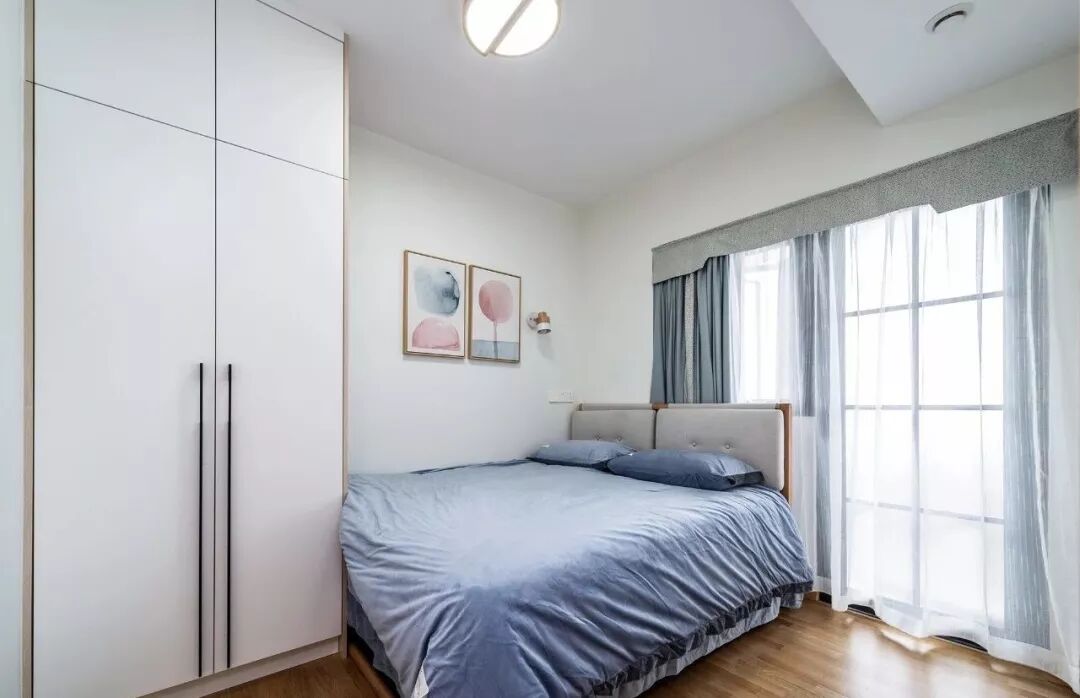 ▲ 主卧,延续白+木基调,用吊灯、窗帘、地毯为空间添彩,打造出清新自然的舒眠环境
