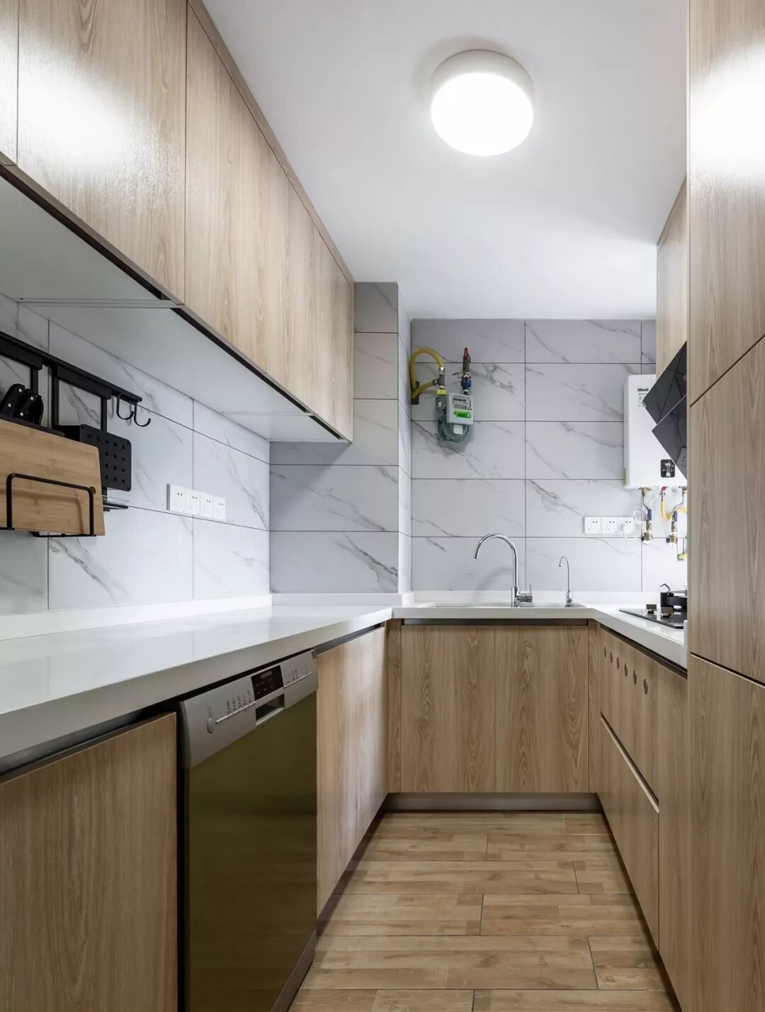 ▲ 厨房,将2.5米L型格局变成5米U型格局,大大增加操作台面及收纳空间,地面铺贴木纹砖呼应橱柜,使视觉更加整体
