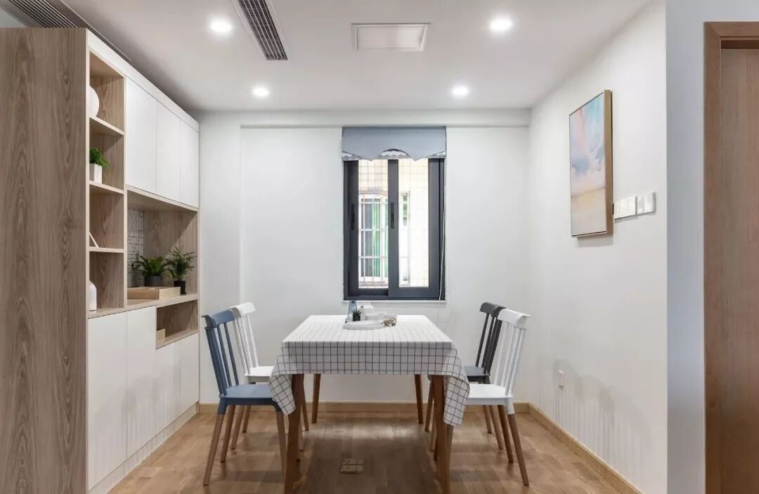 ▲ 餐厅,地面延续木纹砖,北欧风餐桌椅搭配留白墙面修饰色彩装饰画,清爽简约
