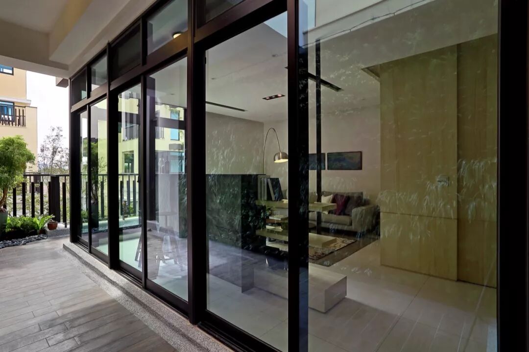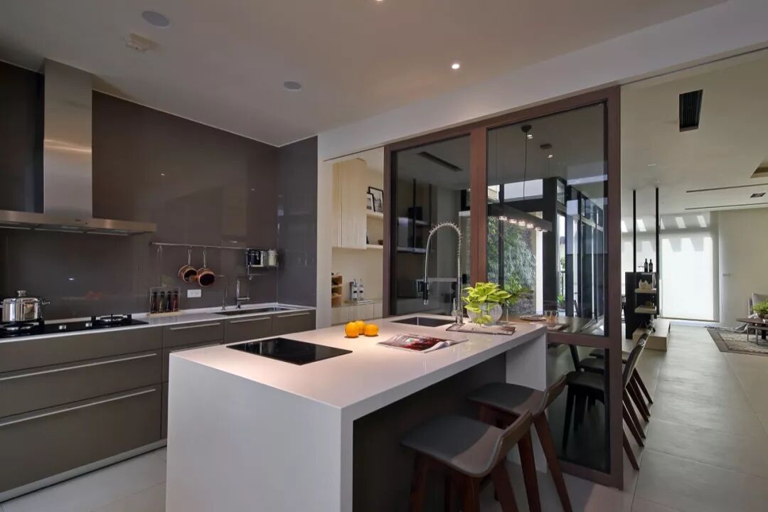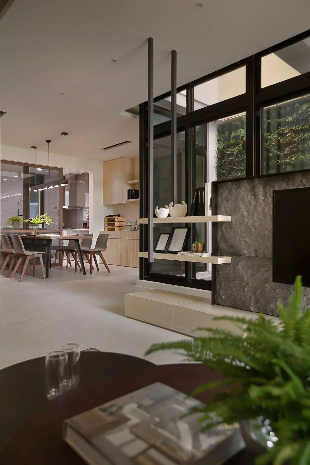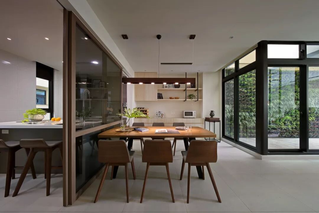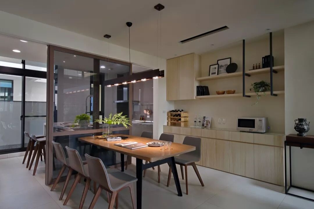 这是与厨房毗邻的餐厅,用推拉式玻璃幕墙做了空间之间的隔断,一方面是减少面积浪费,另一方面也是让采光更好。而且餐厅同时可以兼具办公功能,与近处厨房和远处客厅的家人都能互动交流。