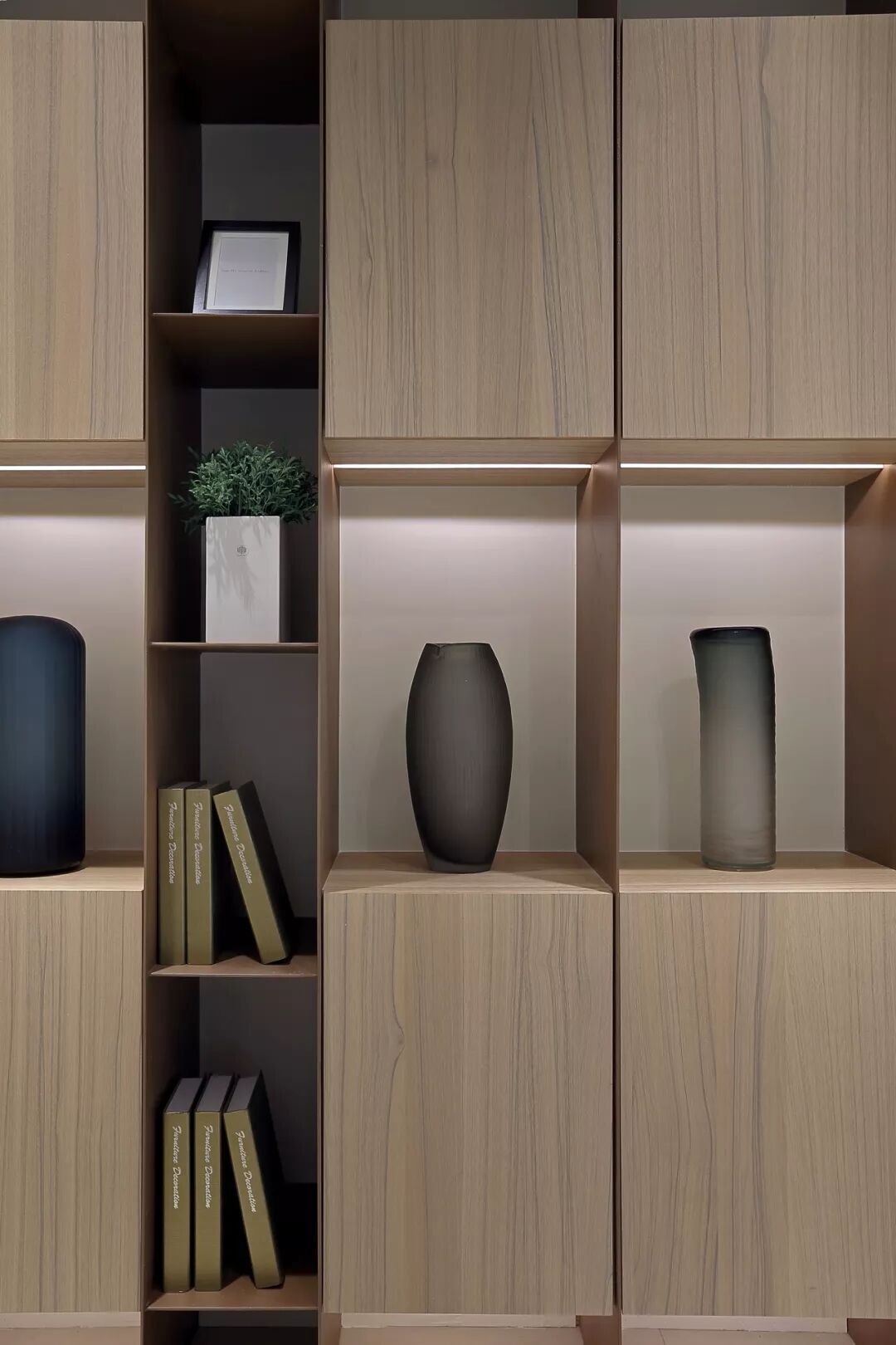 这面电视墙是这个项目的一大亮点。首先,设计师用了半墙的设计手法,让空间进深拉长,通透感更强,尤其重要的是,坐在沙发上看电视的时候,主人可以透过落地窗看到花园里面的绿植墙,视觉上更加舒适。这种“借景”的手法在日本、欧洲当下的设计中也是被普遍使用的。