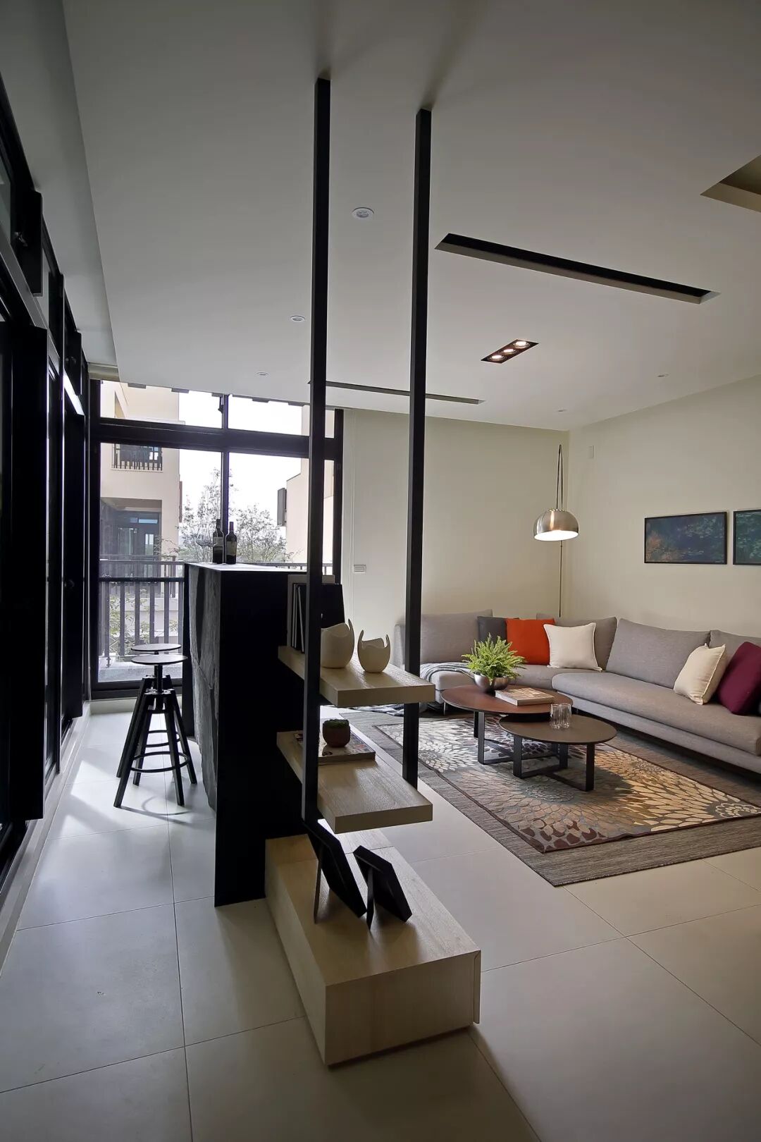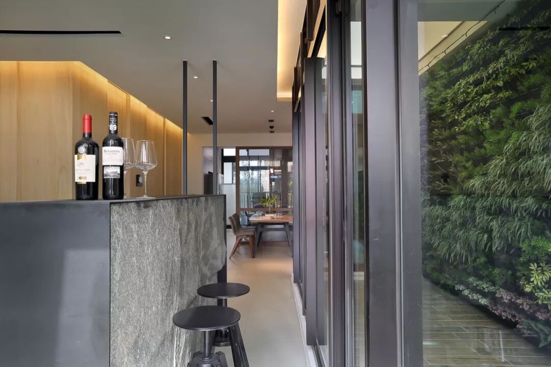 我们再来看电视墙的另一侧,设计师独具匠心,在墙体与落地玻璃之间留出来空间,营造了一个MINI吧台,因为与户外花园连接,这里成为了一个惬意的休憩区域。