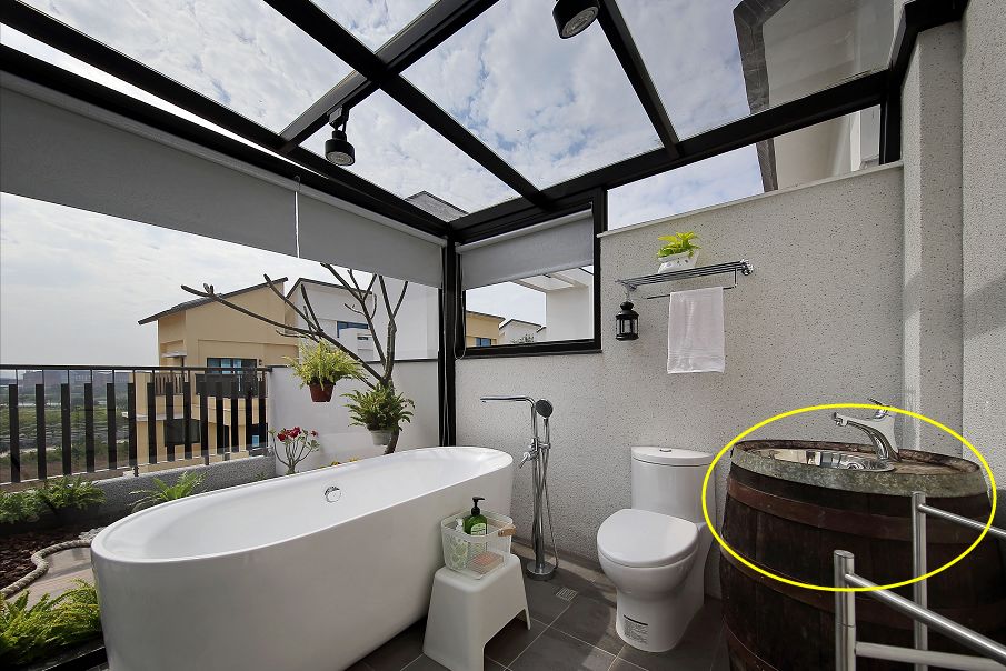 橡木酒桶是主人家里留下的旧物,觉得是曾经的一个回忆,所以迟迟没有舍得丢掉,设计师在这次翻新改造中,充分借用了它的造型和尺寸,把露台淋浴房的手盆放到了木桶里面。真的要给设计师独辟蹊径的思想和情感投入一个大大的赞:旧物再利用;原木、金属、陶瓷材料之间的碰撞与混搭;合理的空间布局,让这个苍穹之下屋顶之上的露台妙不可言。