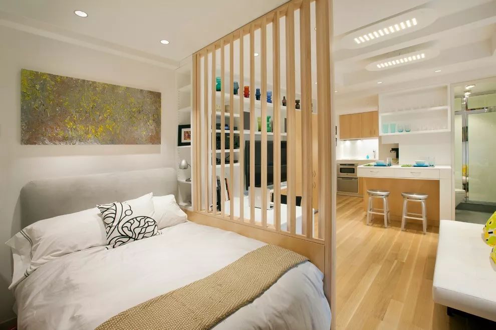 卧室和客厅的分隔,可以选择磨砂质感的玻璃门或木质栏杆作为隔断,既可以保证卧室隐私性,又不占据空间,特别适合小户型。