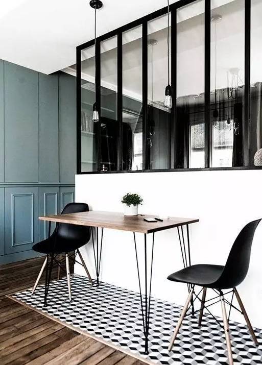 也可以做一半的玻璃门隔断,半墙形式的隔断下层还可以做收纳的空间。