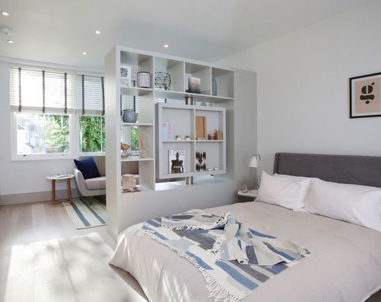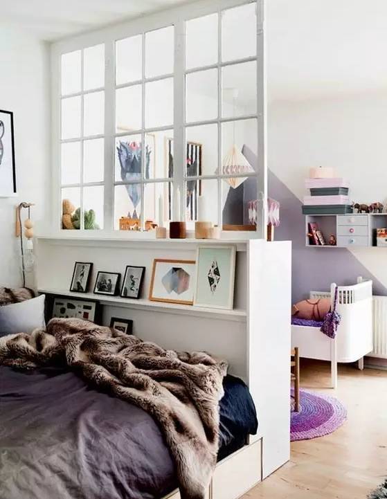 对于只有一个大房间或者想在客厅隔出一个可供客人睡的区域的人来说,利用一些实用度高的方格收纳架隔断空间,是一个不错的选择,杂物有了归置的地方,又隔出了一个小“卧室”。