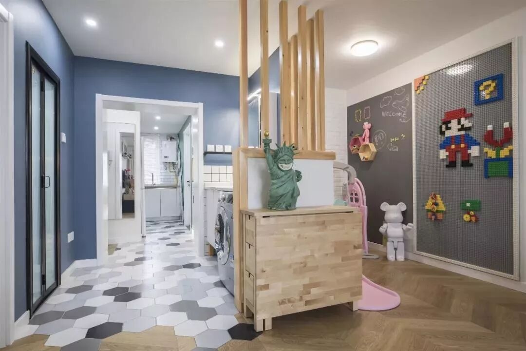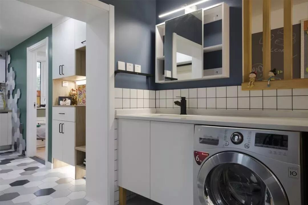 在玄关和客餐厅之间是卫生间的干区,把洗手台给放在了门外,洗衣机也嵌入洗手台当中,上方刷成深蓝色的墙面让整体配色更有格调感。