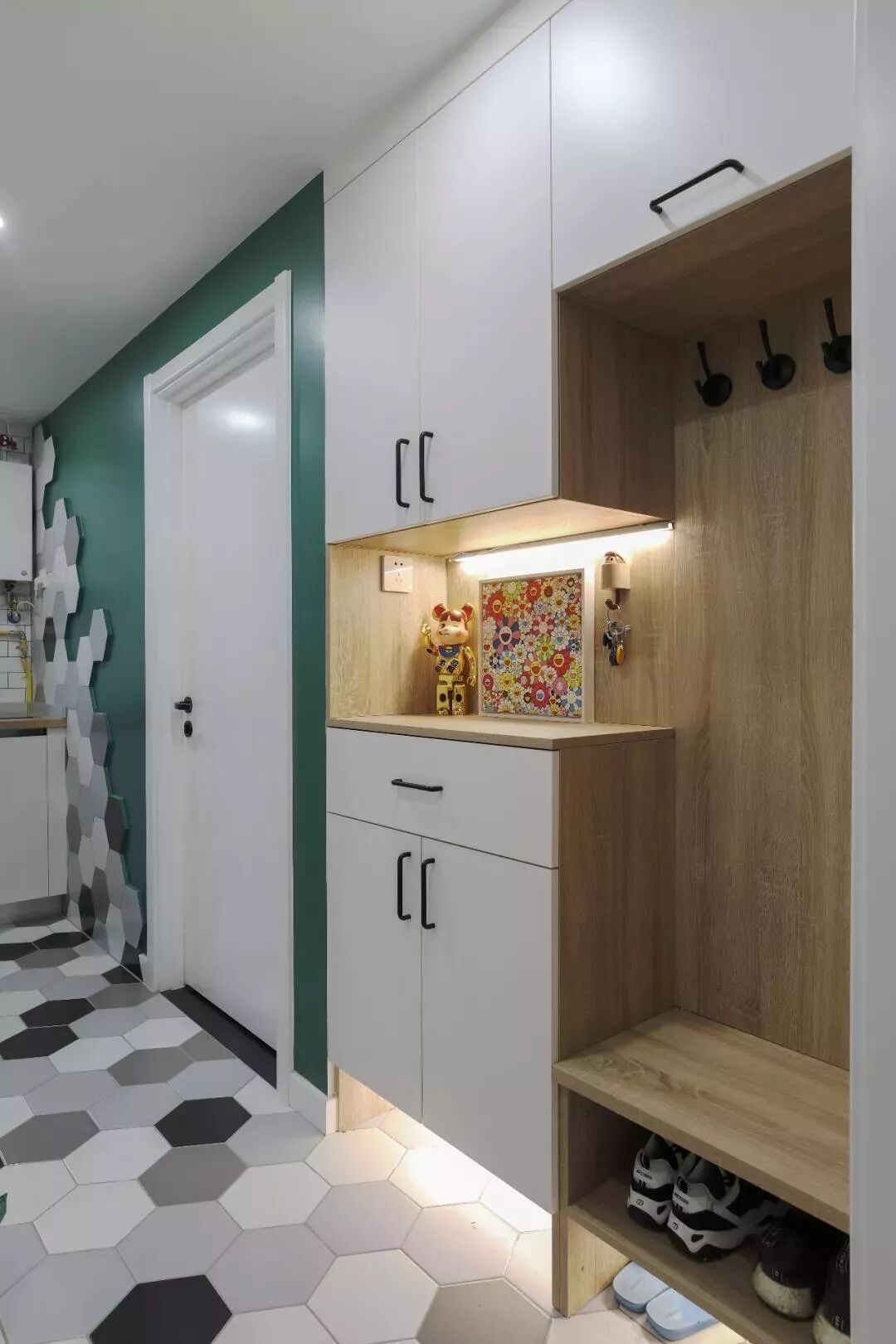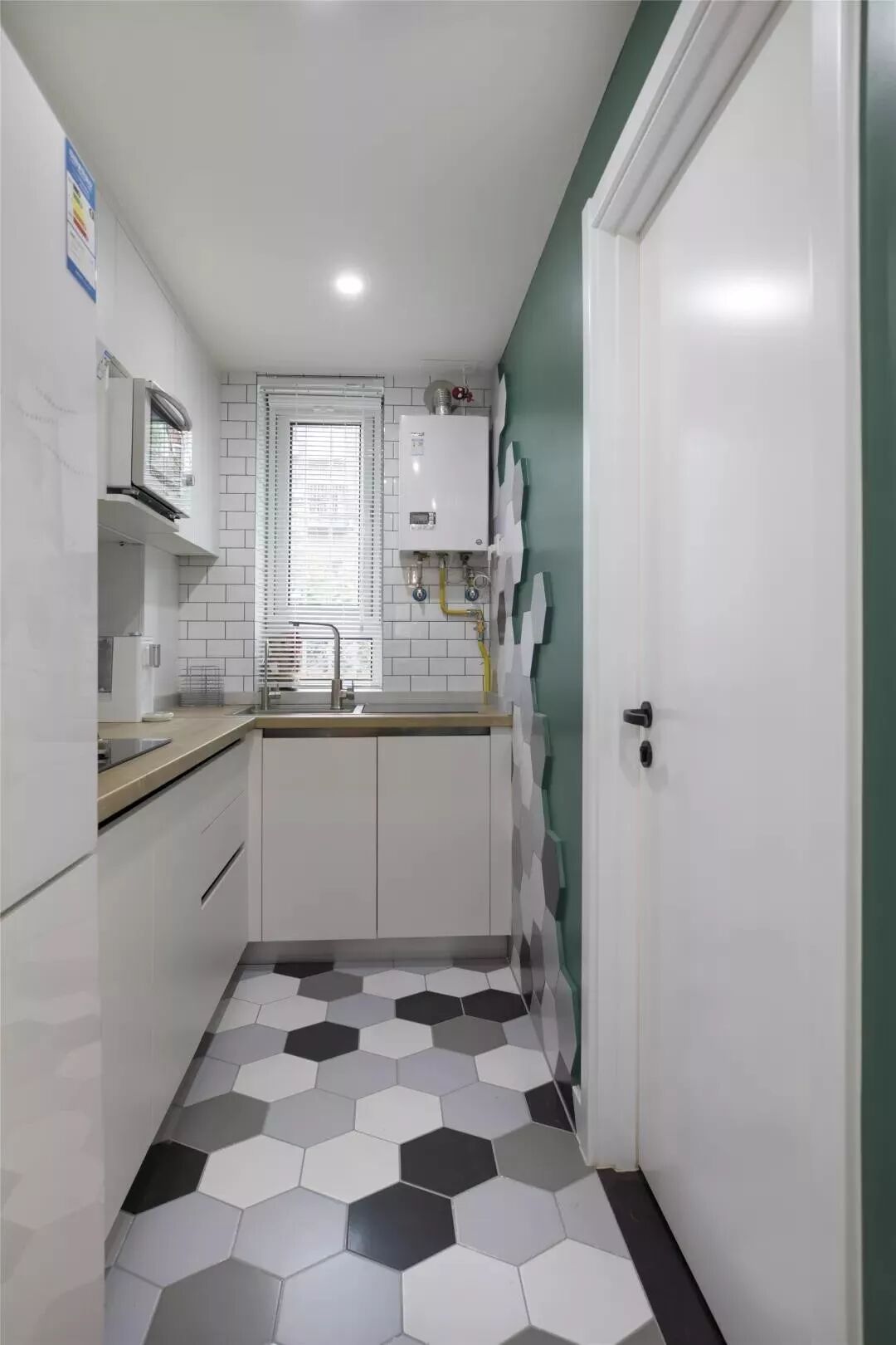 入户的这个走廊空间被屋主作为厨房来使用,L形的橱柜布局方案更适合狭长的空间,黑白灰的六边砖结合青色的墙面带来了北欧风的文艺感。