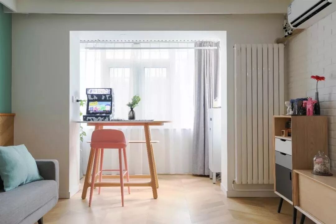 客厅和阳台之间也没有做隔断门,屋主在这里摆放一个轻便的小吧台,增添了家里的情调感。阳台处做上升降式的晾衣杆,避免衣服没地方晾晒。