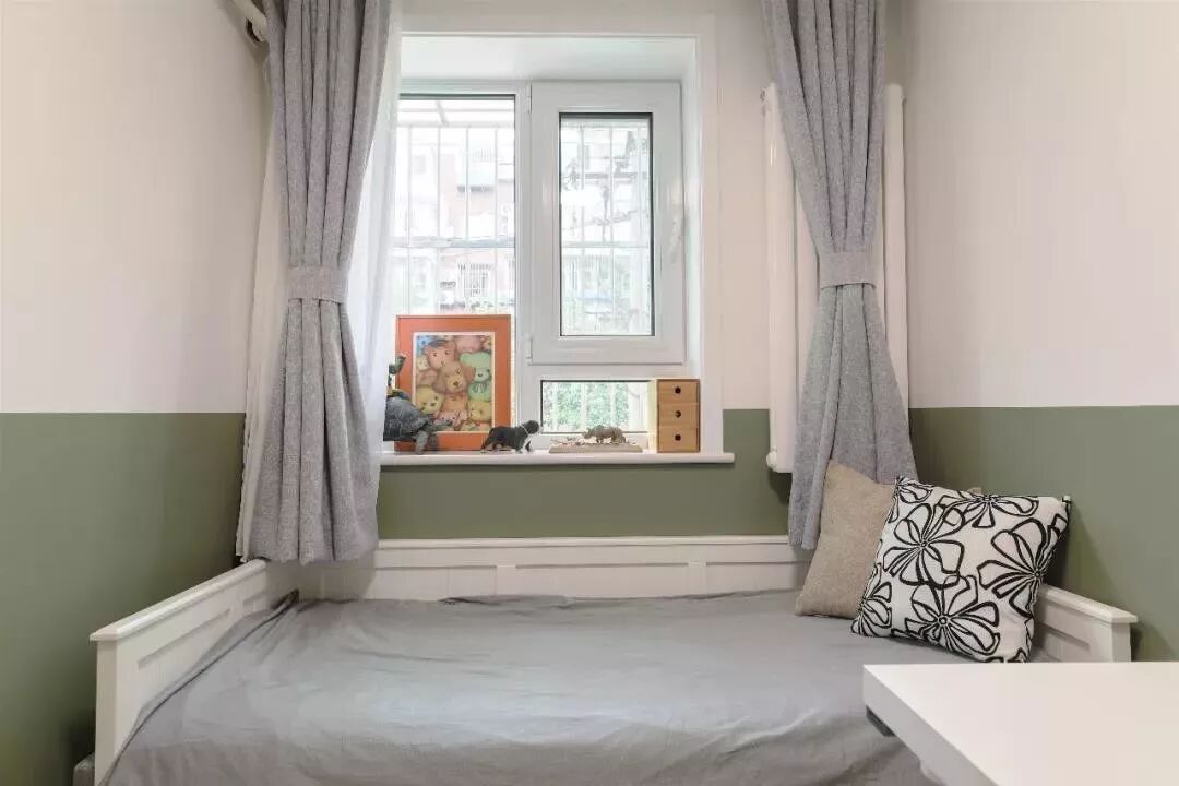 儿童房的墙面是做了拼色墙的设计,让人感觉更有层次感。儿童房的空间比较小,把床也做成收纳款的,再加上一个小书桌,使用起来非常方便。