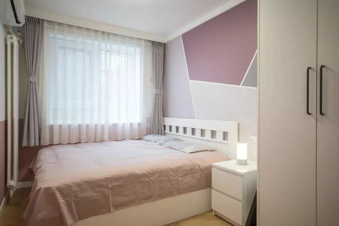 主卧室的床头背景墙铺贴了壁纸,壁纸的图案是不同颜色的几何图形,搭配粉色和灰色的软装,让整个卧室看起来更加浪漫和优雅。