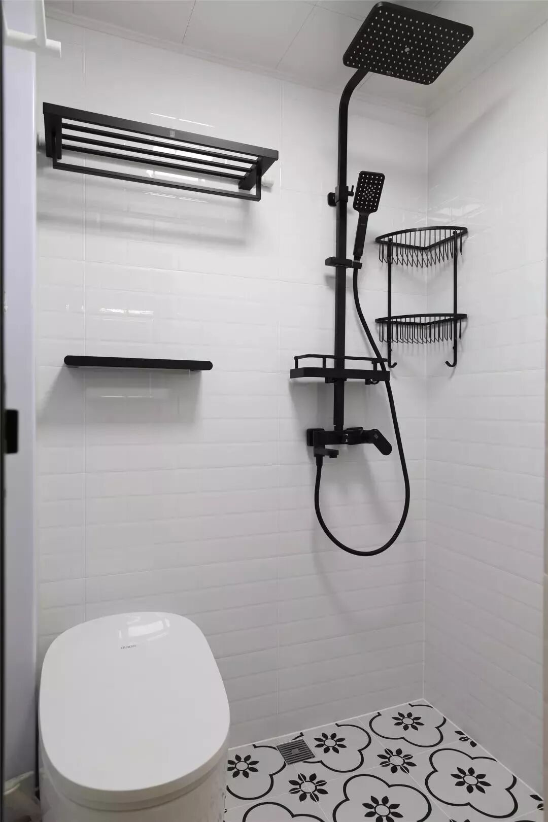 卫生间的内部没有做干湿分离的设计,毕竟这个空间太小了一些。白色为主的卫生间搭配一些花砖作为点缀,这样的卫生间看起来简洁又时尚。