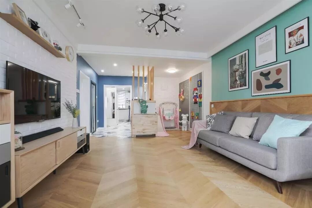 为了避免餐桌没地方摆放,设计师选择了客厅无茶几的设计。鱼骨拼的木地板让客厅看起来更宽敞。文化砖的电视背景墙和青色的沙发背景墙带来清新、文艺感。