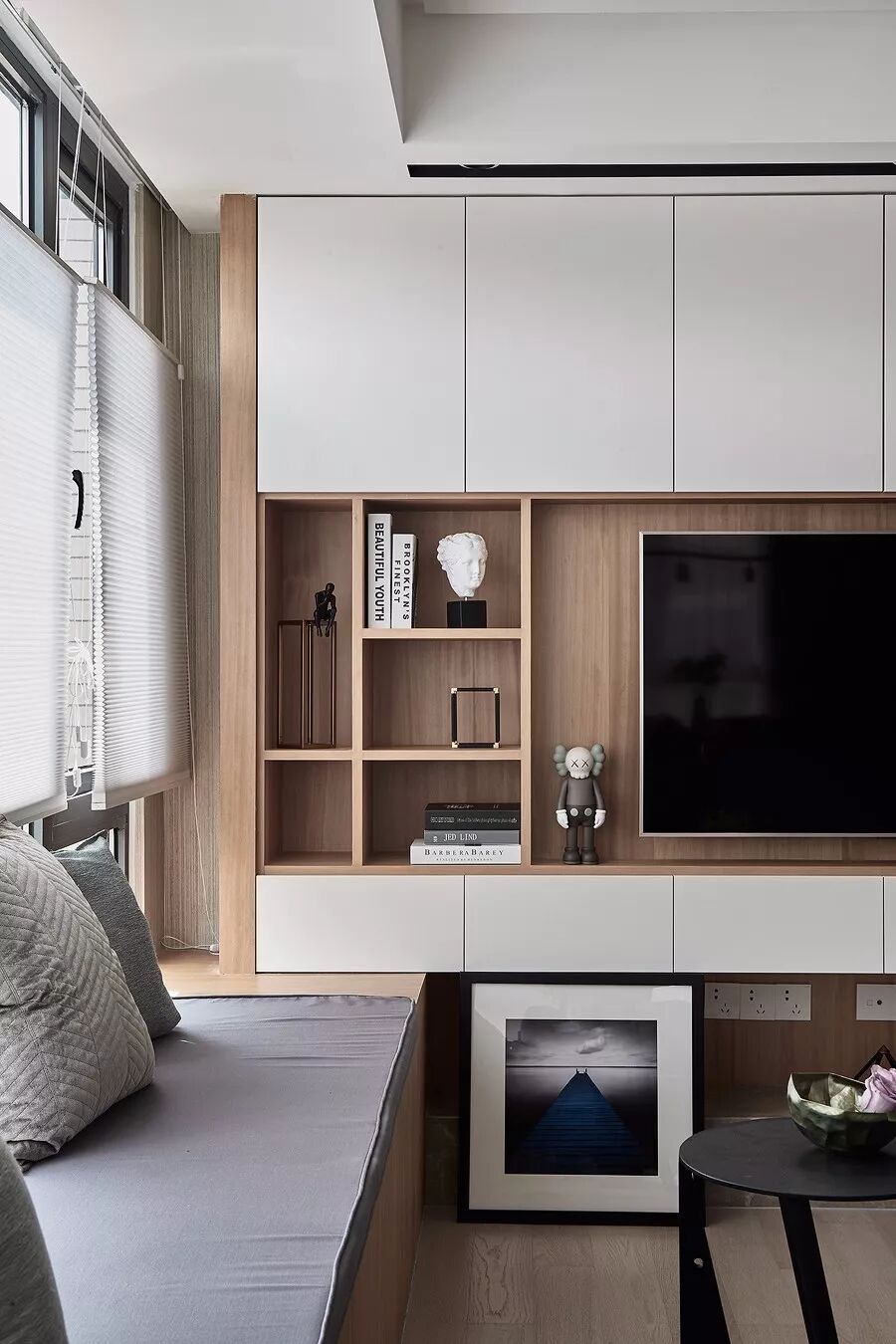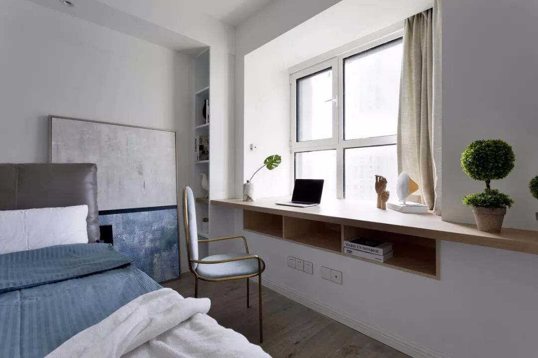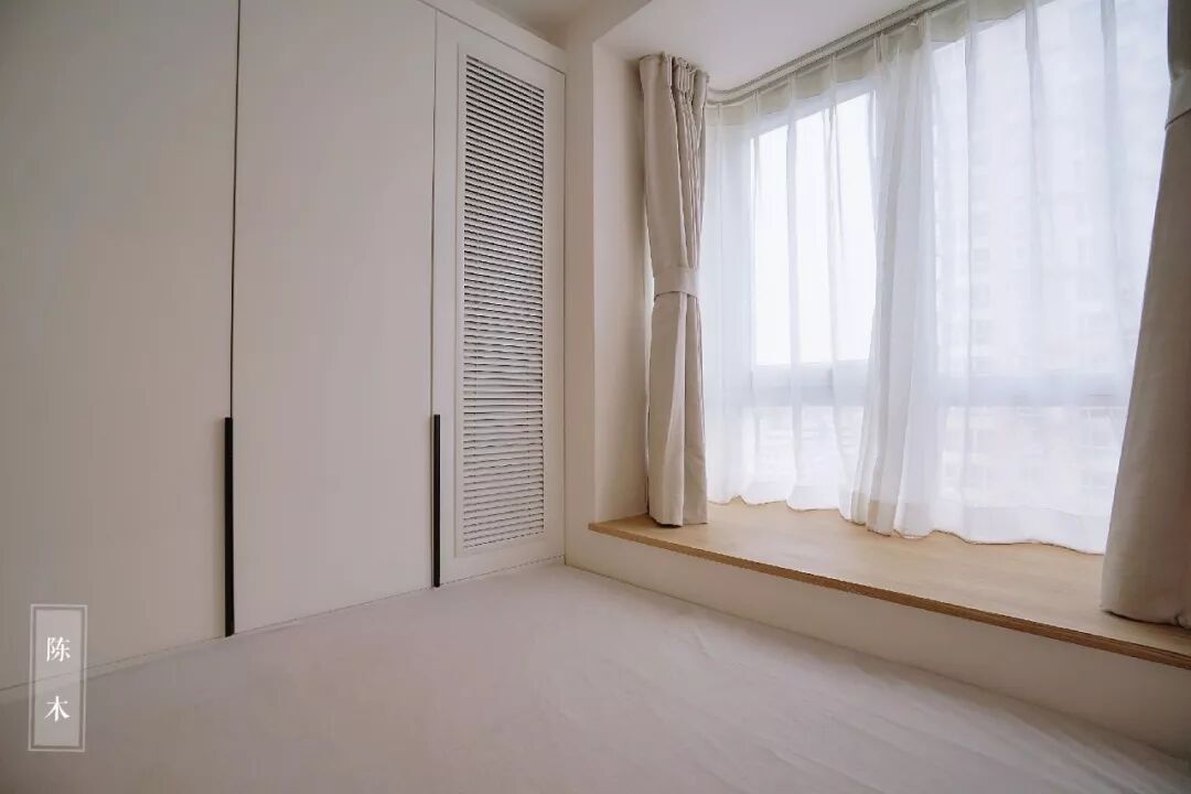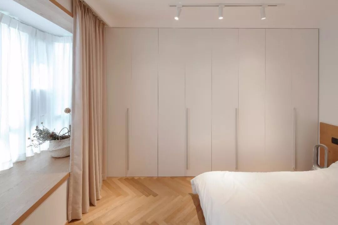 在做定制柜的时候,在飘窗台上加装木质窗台面,让飘窗兼备收纳功能,这是一体性比较强的实用设计。