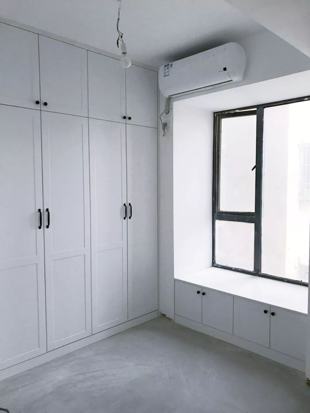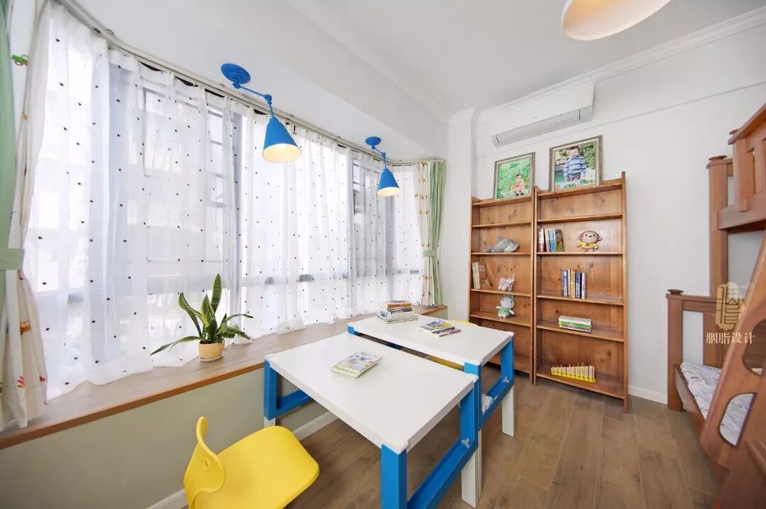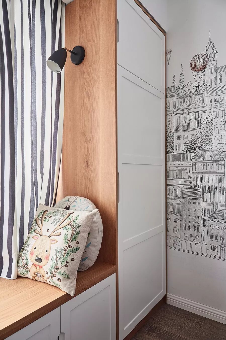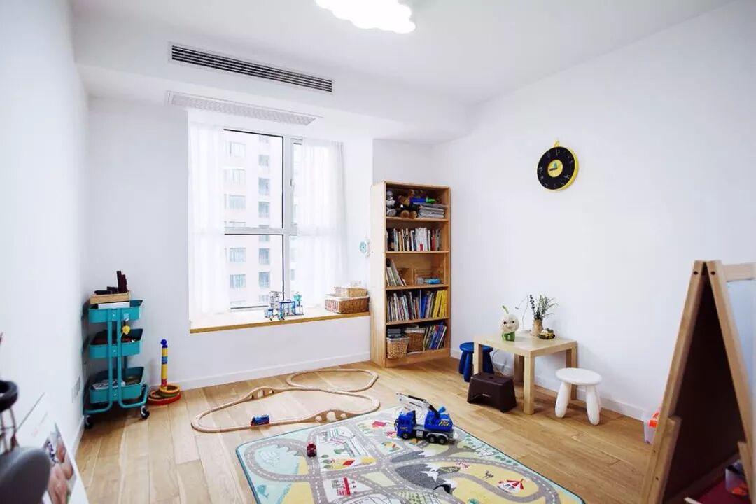在做定制柜的时候,在飘窗台上加装木质窗台面,让飘窗兼备收纳功能,这是一体性比较强的实用设计。