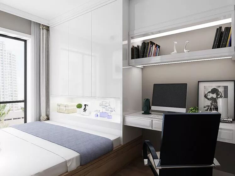 ▴巧用飘窗+榻榻米,将不常用的次卧改造成多功能房间。
