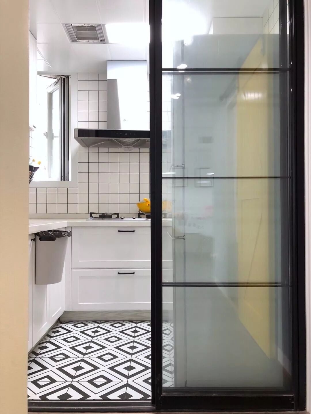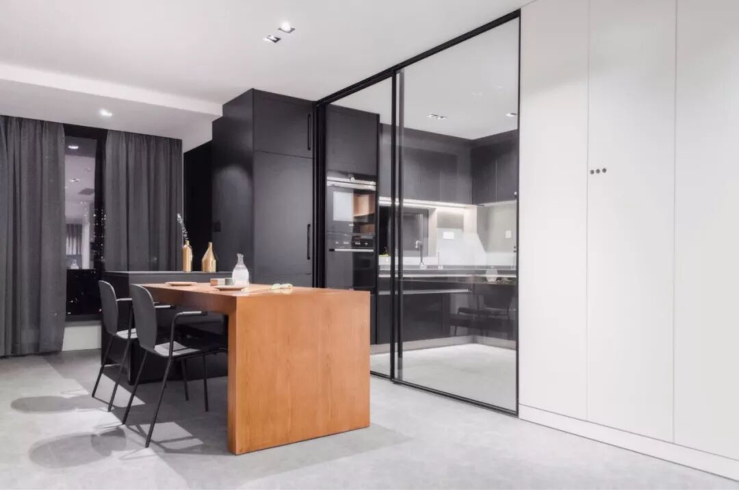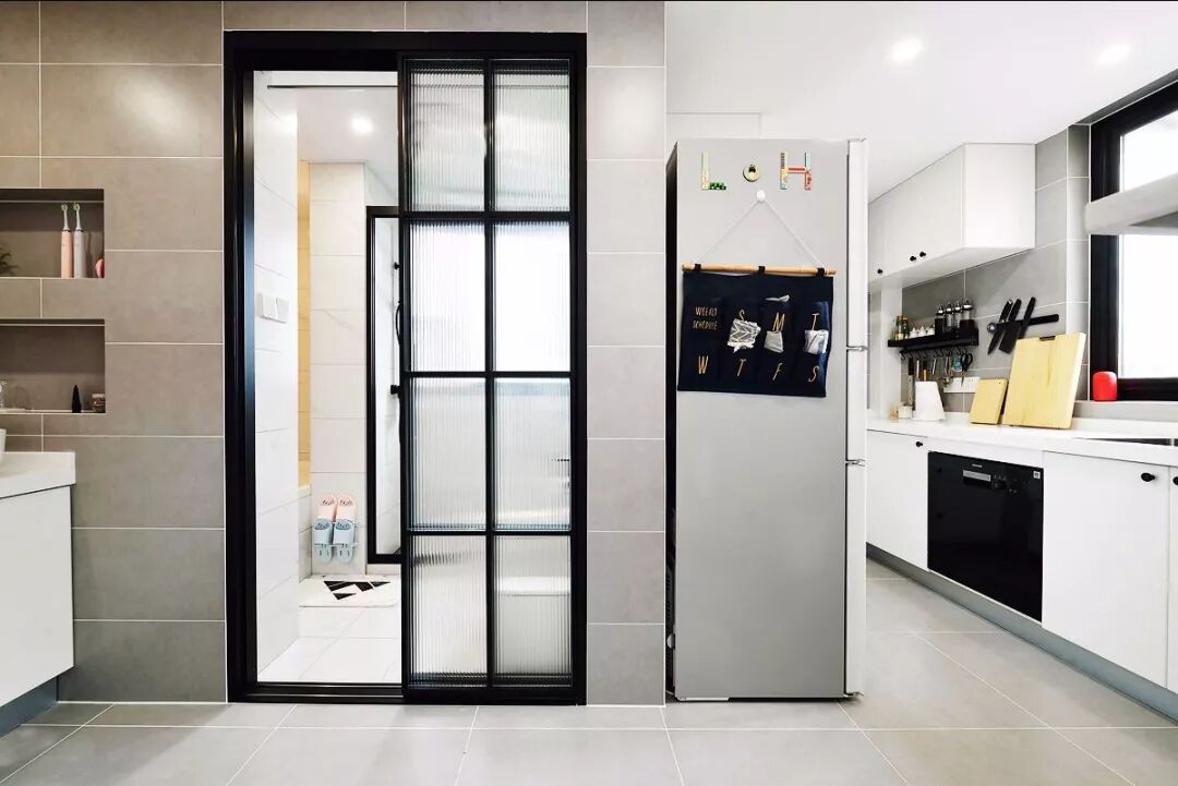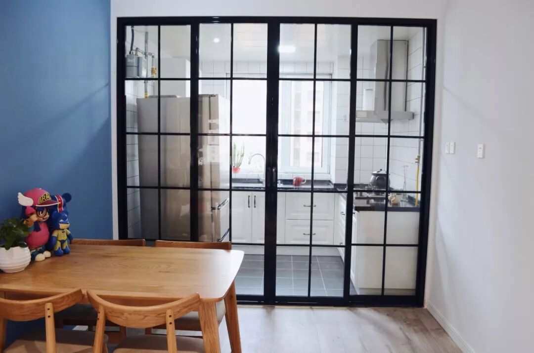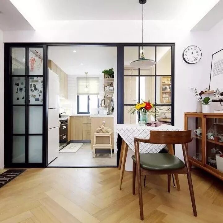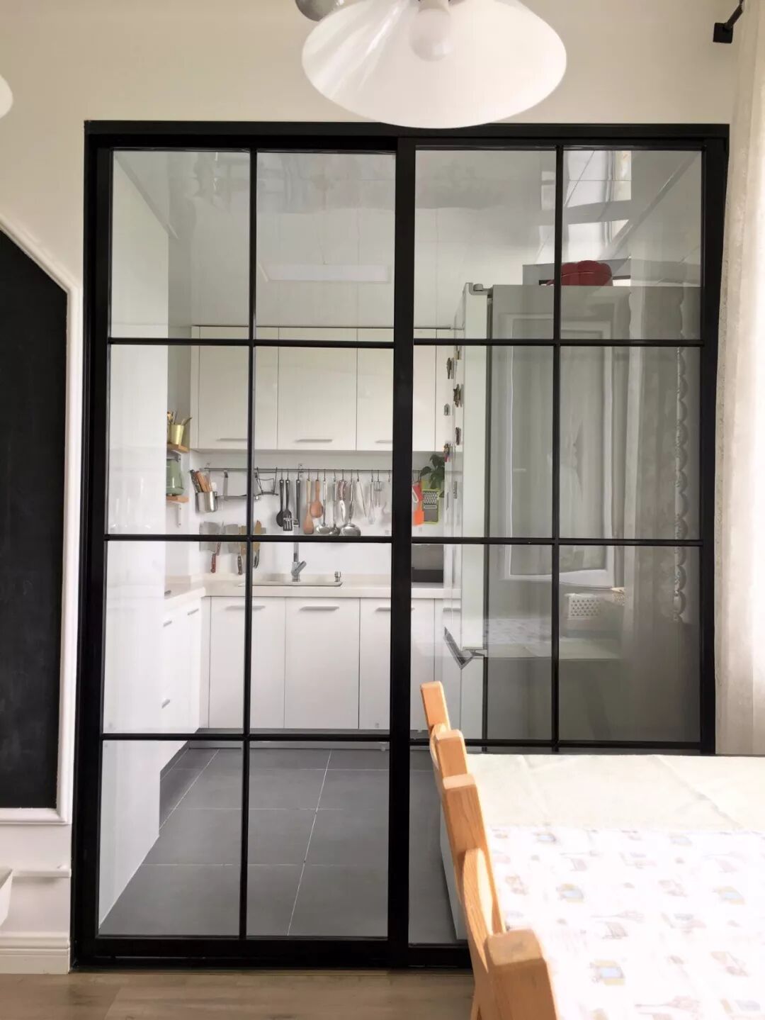 在多数家庭的装修中,厨房门都是选择玻璃推拉门的设计,若是觉得木色陈旧、白色不耐油烟的话,那么换上一扇黑框玻璃推门,搭配上简约文艺的细节布置,将会使得整个厨房充满清新舒适的氛围感。
