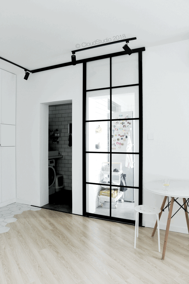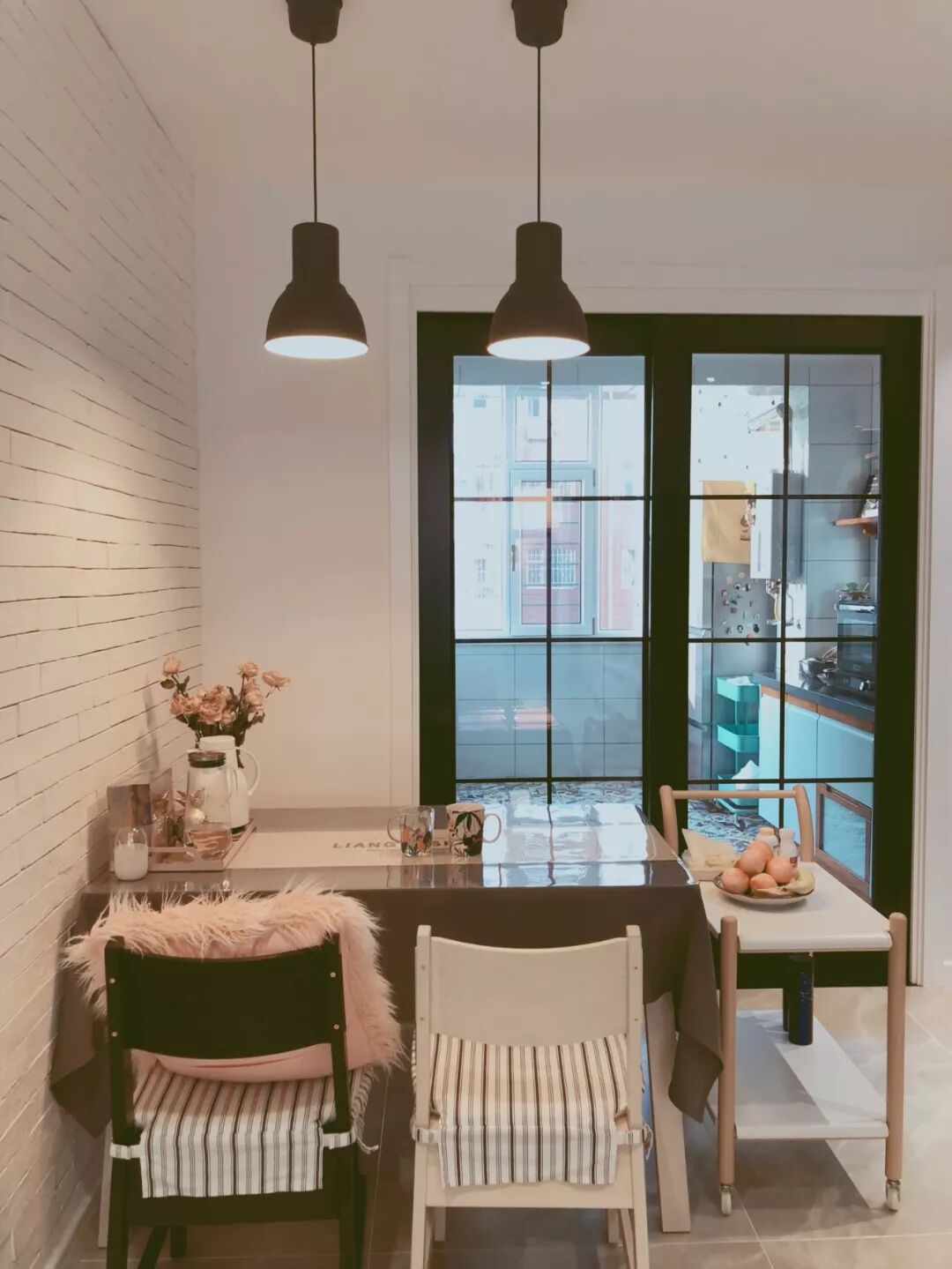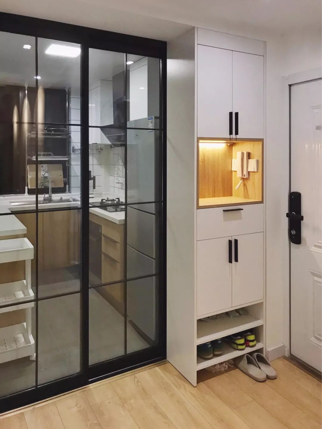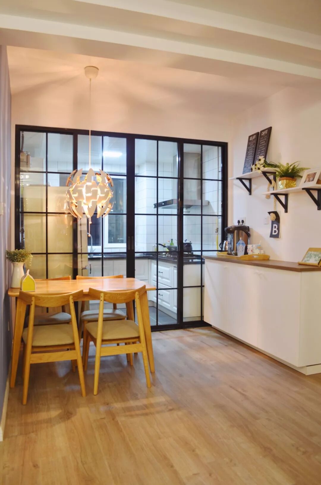 在多数家庭的装修中,厨房门都是选择玻璃推拉门的设计,若是觉得木色陈旧、白色不耐油烟的话,那么换上一扇黑框玻璃推门,搭配上简约文艺的细节布置,将会使得整个厨房充满清新舒适的氛围感。