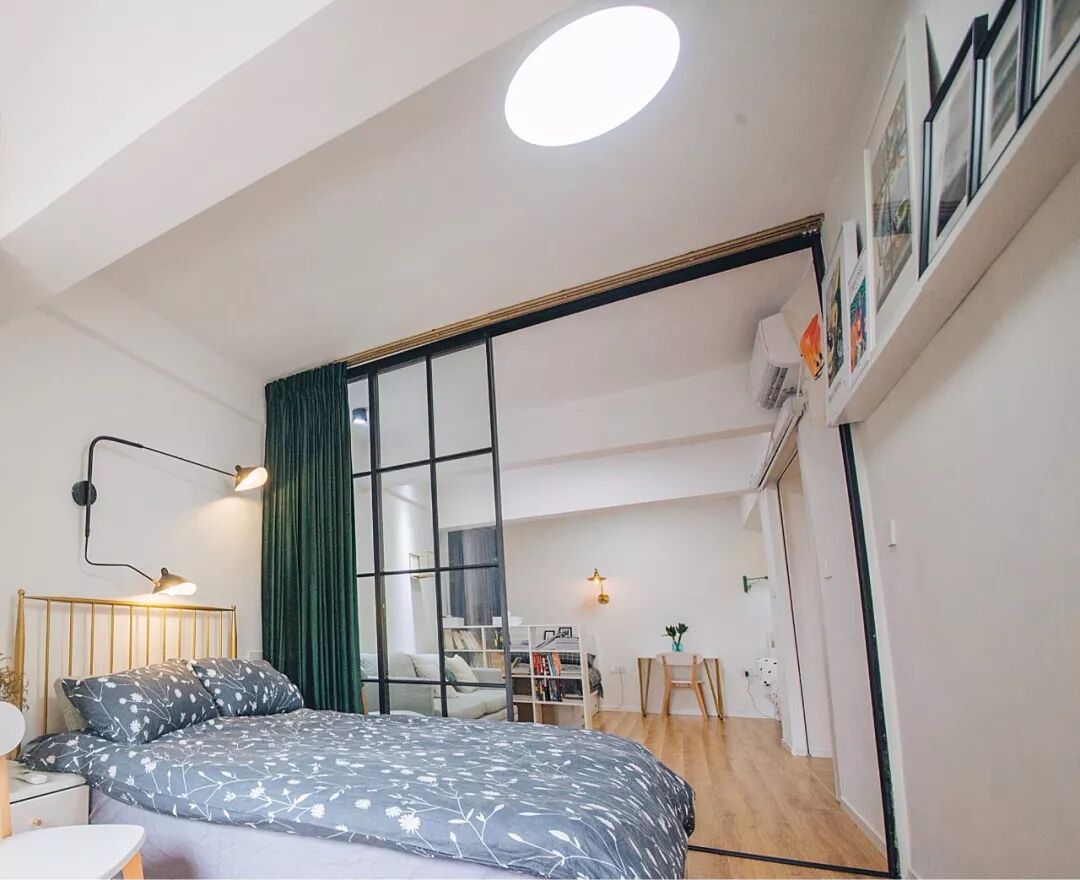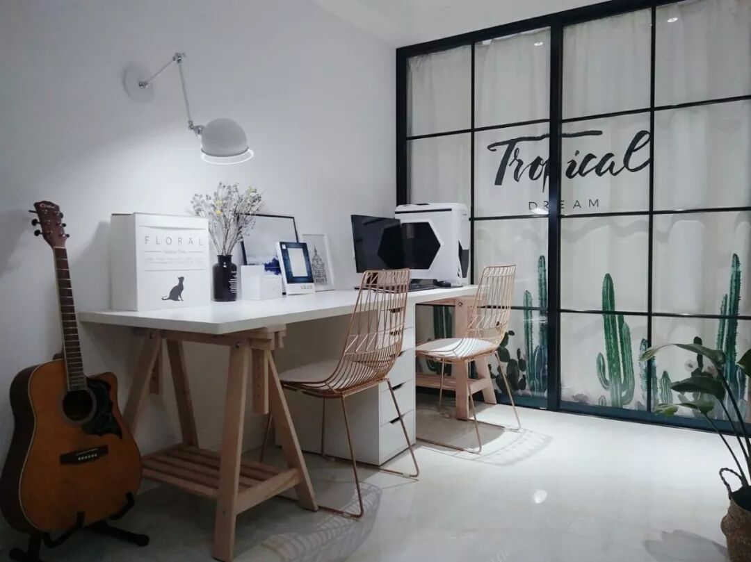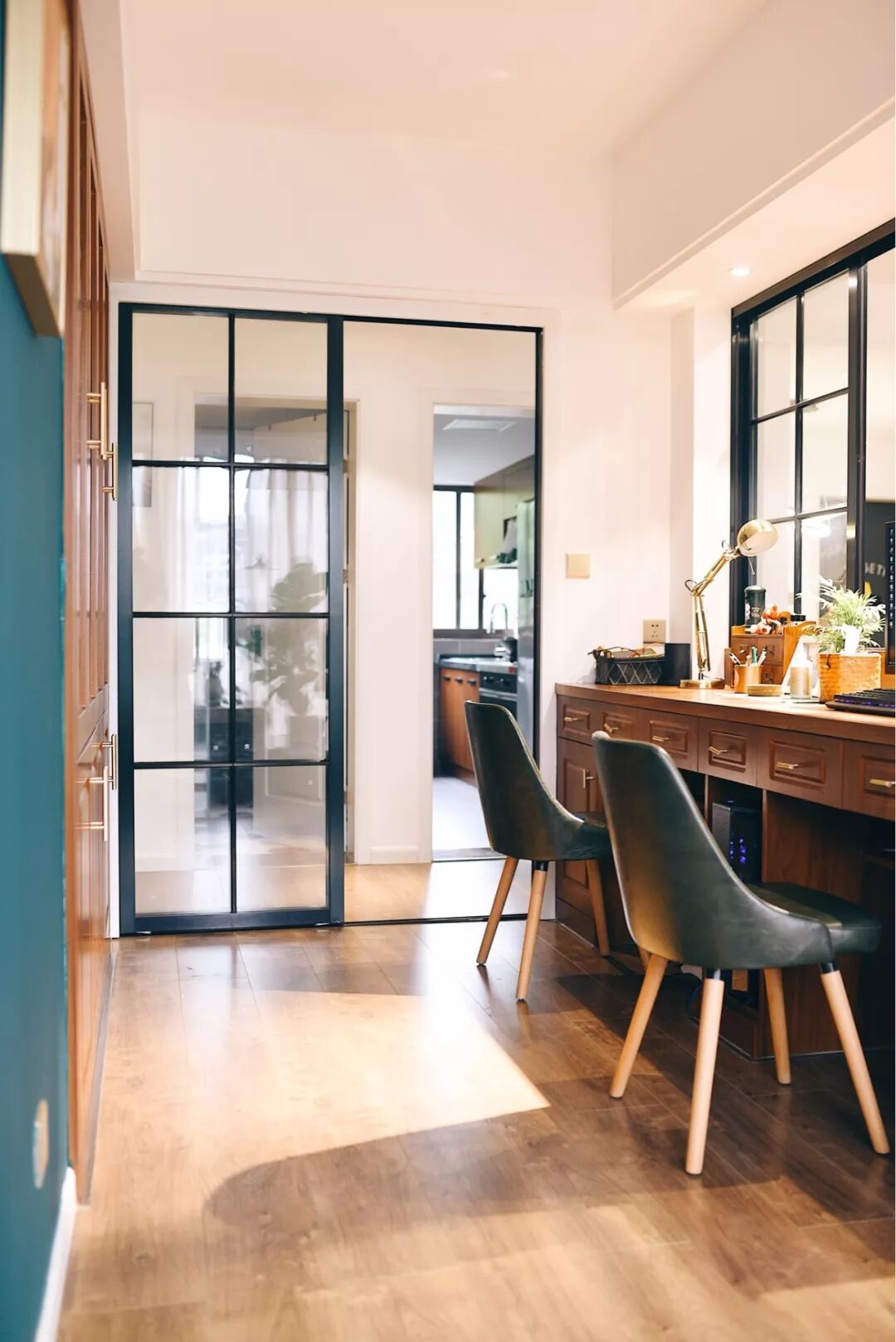 户型采光不佳的可能会设计开放式书房,也可以考虑用黑色边框的玻璃门,让书房更加成熟庄重,封闭书房的同时又能让采光在室内贡献,放大空间的视觉感。