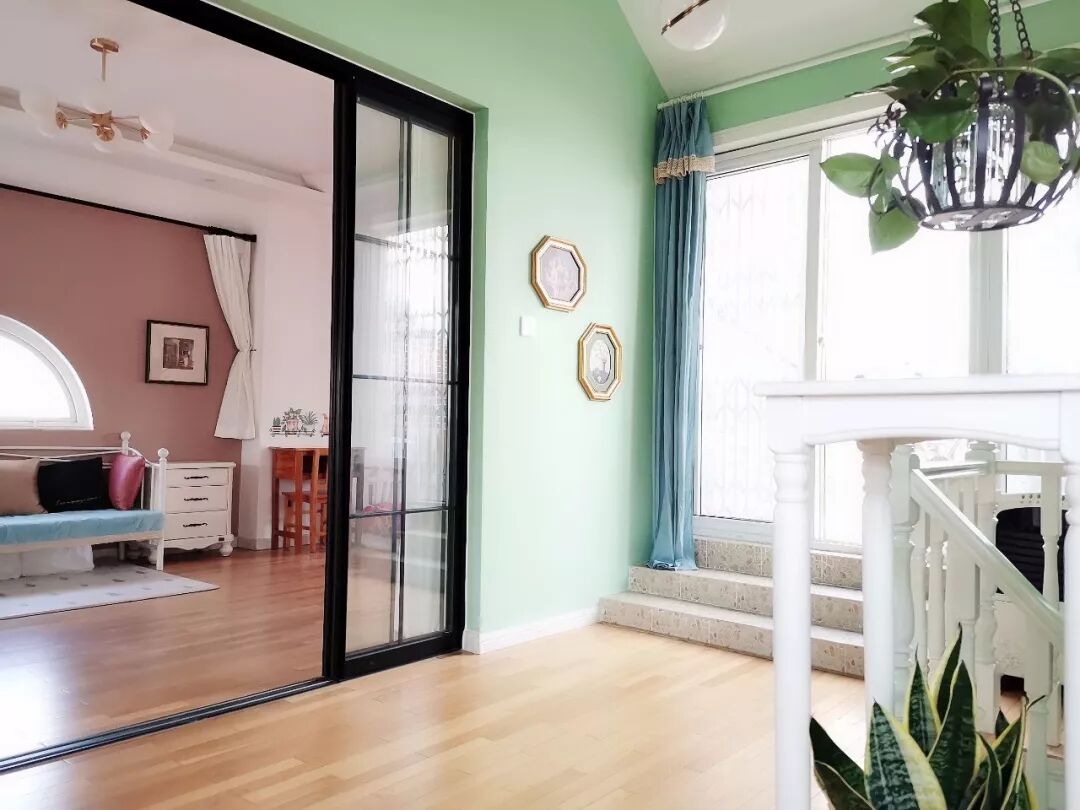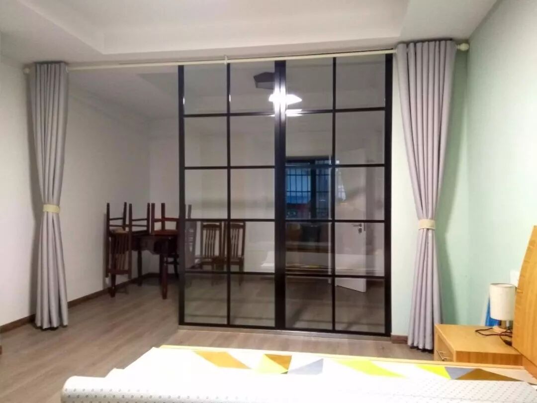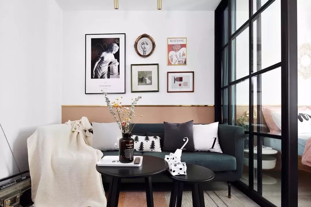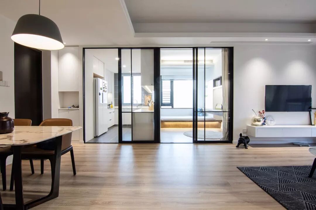客厅的隔断门,在公寓户型中用作隔断卧室与客厅,或是隔开客厅与前厅等隔断功能的玻璃门,以黑框的玻璃门,显眼的边框会让空间之间的视觉更加分离独立。