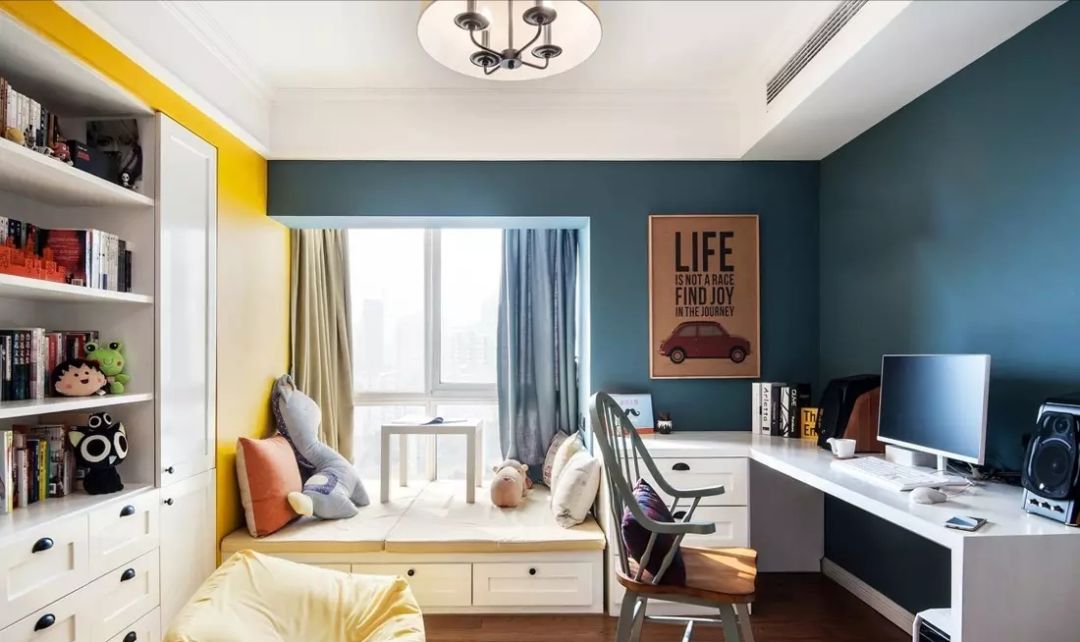 榻榻米+书柜的设计,也很受人们的欢迎,榻榻米可以用来储物,书柜用来办公,开放隔板可以收纳各种书籍和摆件,转角的设计增加了可活动空间,使办公更加便利愉快。