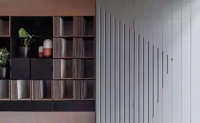 为了进一步隐藏门板的缝隙,设计师干脆将整面墙设计为同样的格状结构,让缝隙自然消失于秩序出现的几何图案中,又让整体设计多了些起伏变化,打破纯色乏味的平面格局。