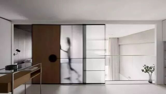 不同于往常同材质间的刻意隐藏,而是大方的用异材质作为拼接门灵感。可以作为门又可以作为移动隔断的两块隔板,采用敦实的木材和通透的玻璃这两种不同材质,形成了空间内的虚实对比结构,无缝隙的设计,又使两种材质完美融合在一起。