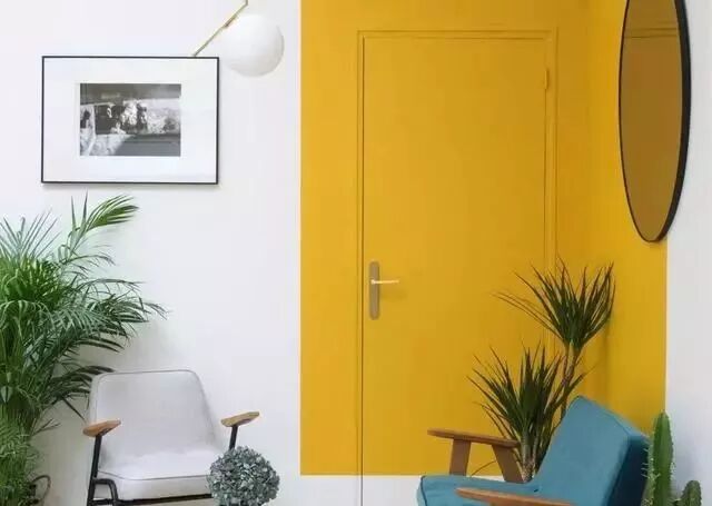 想要拥有隐藏门,又不想更换家中现有的门板,那也有简便式隐藏门的做法。在现有门板和周围墙之间用彩色的色块建立起连接,让门在色彩中消失。而色块也是墙面的装点,让空间充满个性化。