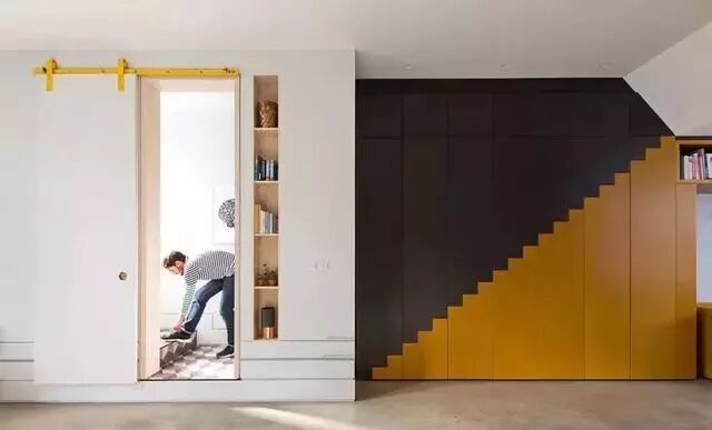 谷仓门也可以算是隐形门的一种。低调的白色推门巧妙地隐藏了洗手间入口,避免了煞风水的忌讳。而且门板上方的亮黄色滑道是空间内的唯一一处亮色,细节处为空间注入活力。