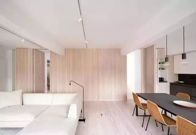 一整面的木墙将空间内所有的门板统统隐藏入内,打造一体化的整合式设计,让空间显得更为规整。木墙表面设计了条形纹理图案,增加了平面的立体感和韵律感。