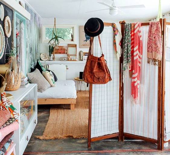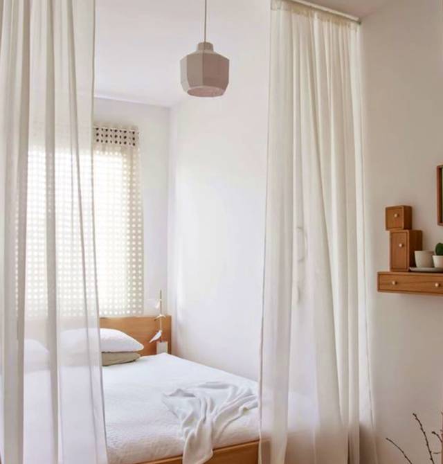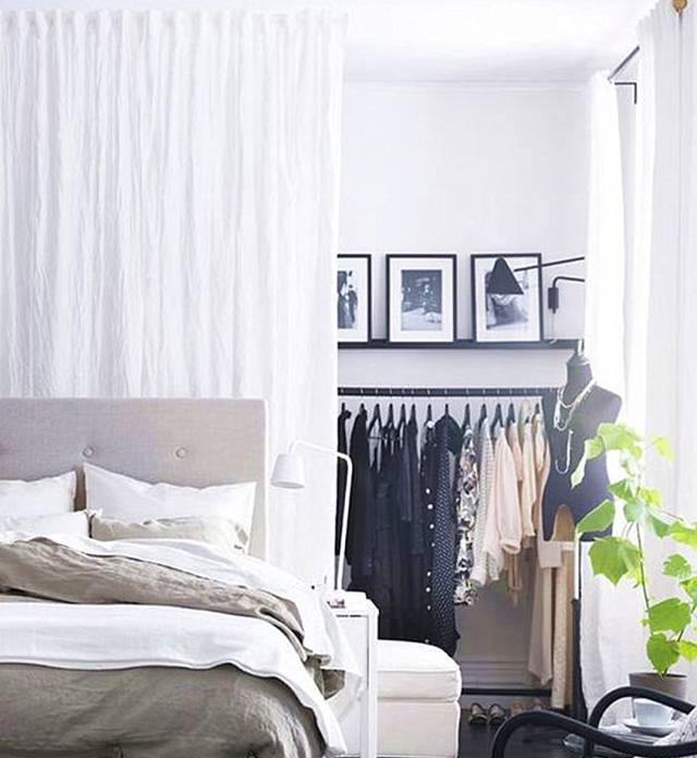 较为厚实的布帘一般用在卧室和衣帽间之间。不想买衣柜、鞋柜,买个简单的衣架,放在床后面,用帘幔遮起来即可。