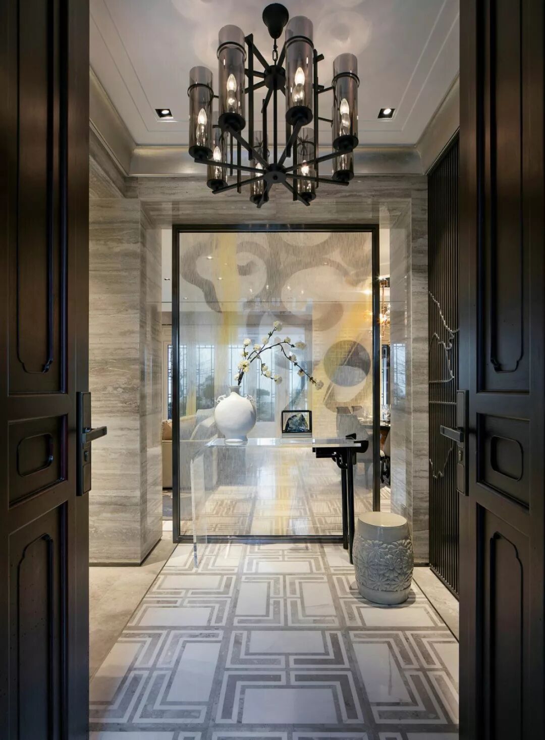 镂空隔断的造型,一般以竖条格栅式居多,也有传统雕花的,回字纹的,运用在新中式风格中显得古朴而典雅,又具有透光、装饰的双重效果,韵味十足。