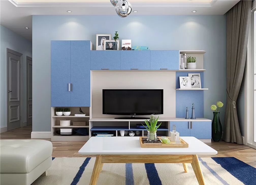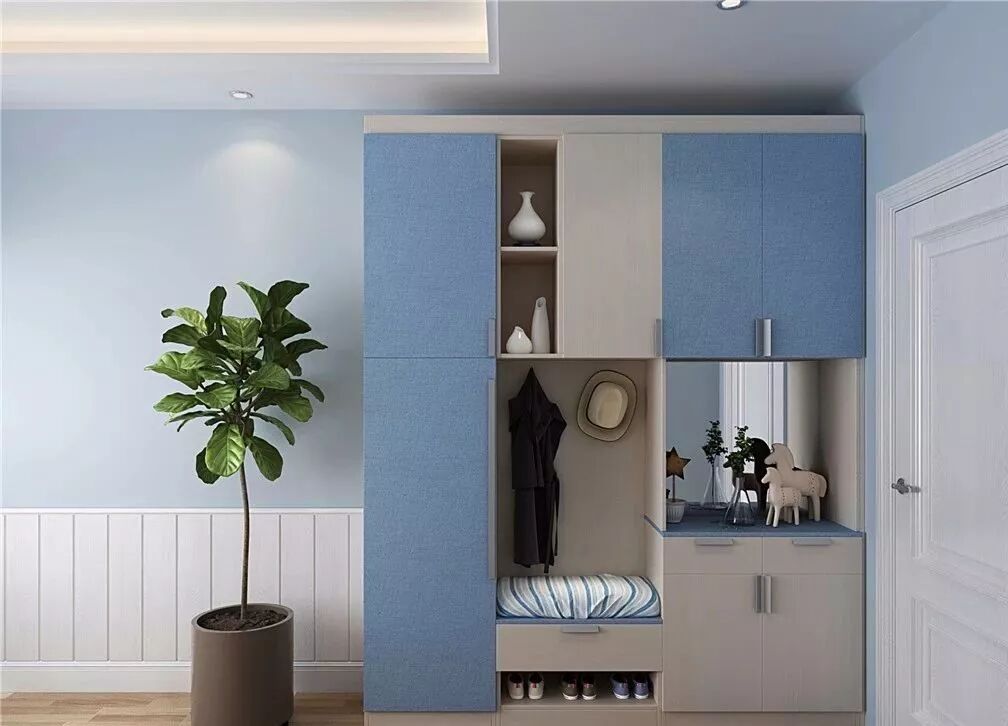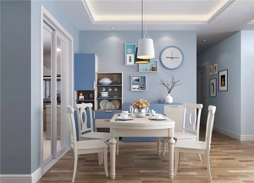 这套方案以福庆蓝色精灵为主色调,清新自然风扑面而来,电视柜、餐边柜、玄关通通定制,不要担心定制家具多会显得空间逼仄,色彩运用得合理还能起到放大空间的作用,柜门和隔板加上一点蓝色精灵,尽添几分清爽。
